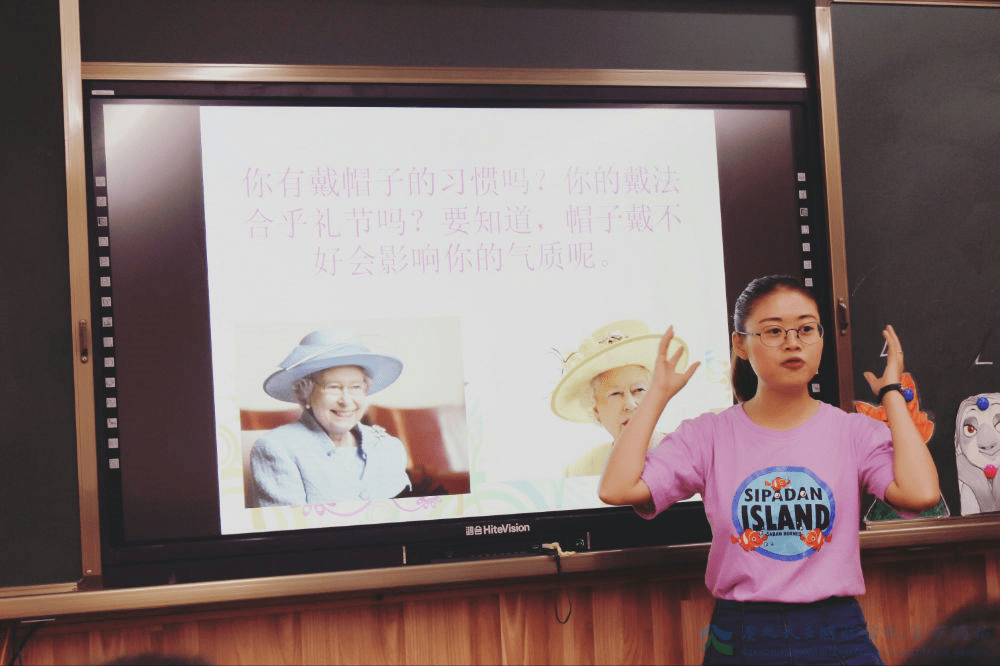 课堂上,当老师提到电影《爱丽丝梦游仙境》中的疯帽子,痴迷地设计的从小到大各式各样的帽子,讲解到as mad as a hatter时,孩子们露出惊喜的表情,原来是这样,心中鼓捣着怎样设计一个属于自己的帽子呢?当老师秀出一张圆顶礼帽,西装笔挺,气宇非凡的绅士图片时,讲到hat in hand大家都异口同声说gentleman,纷纷行起了脱帽礼!