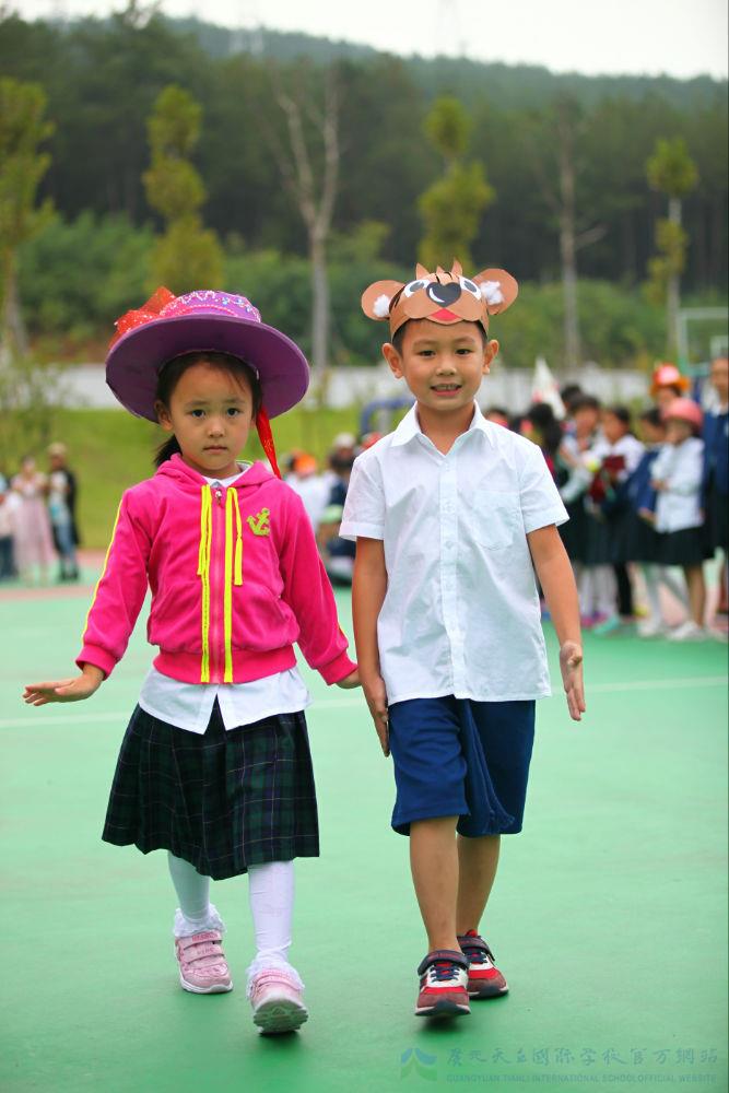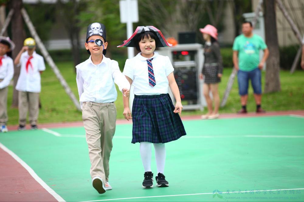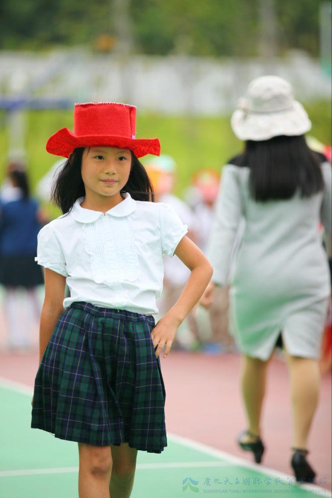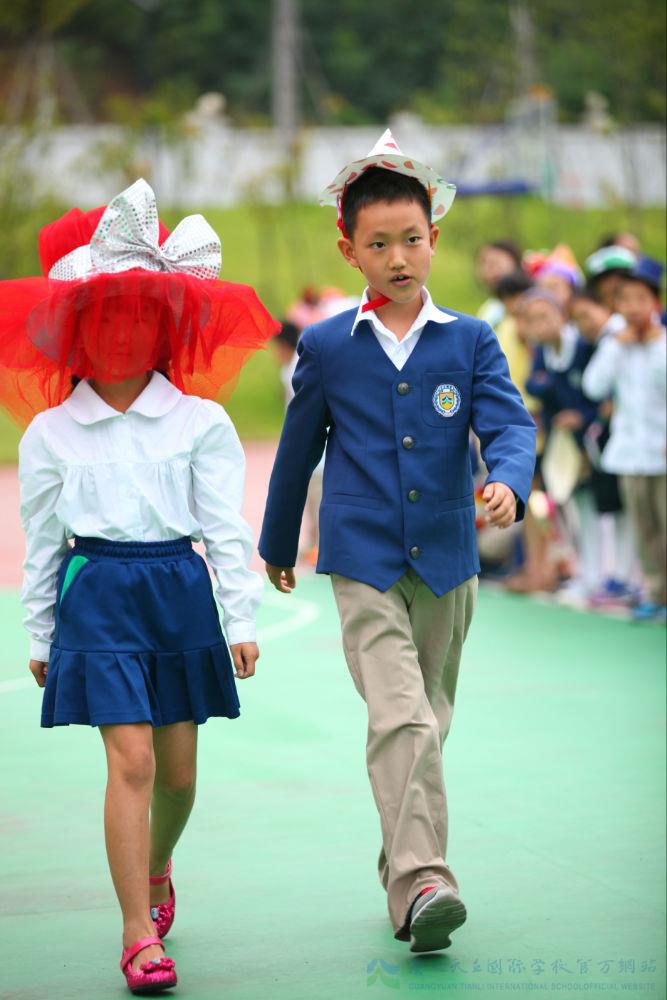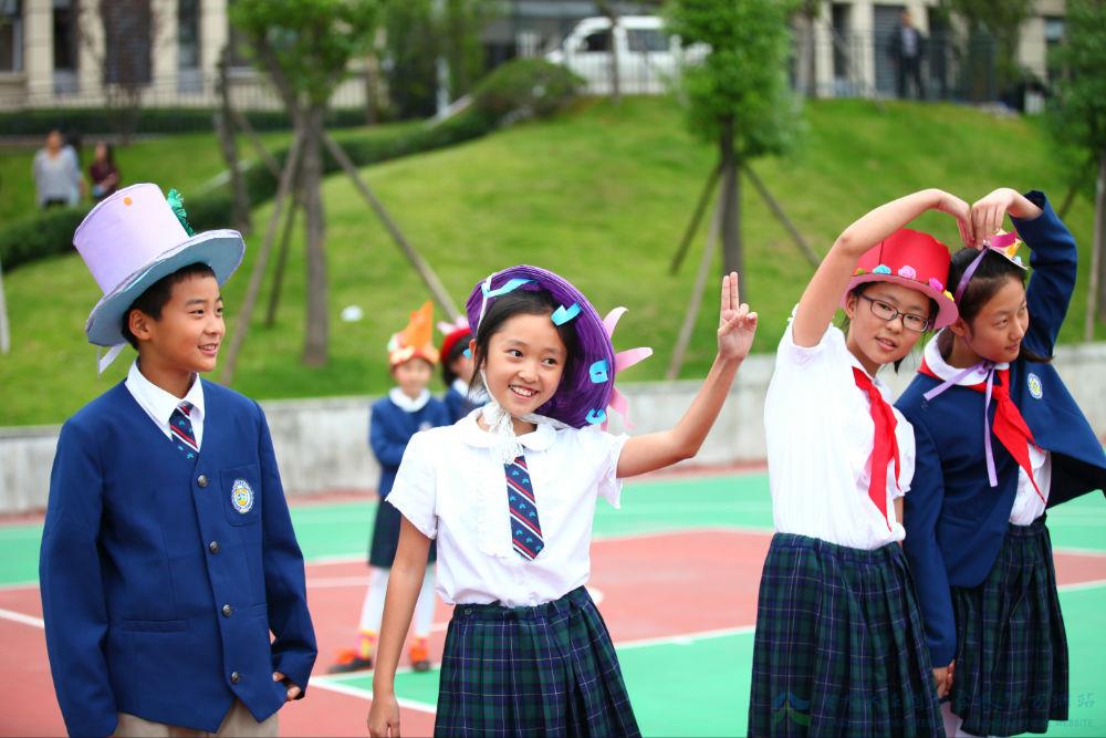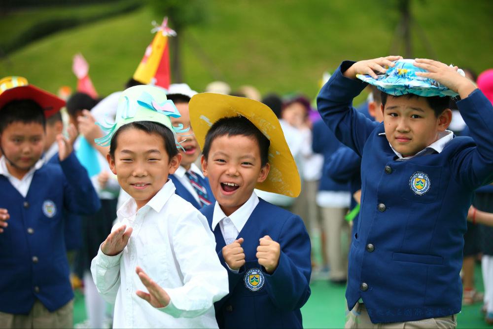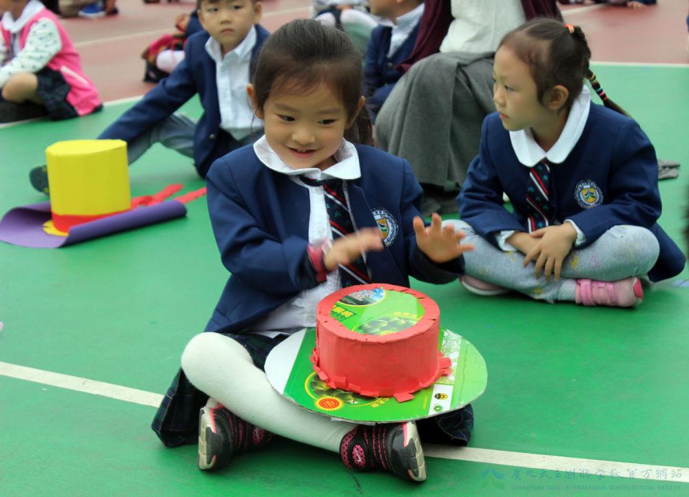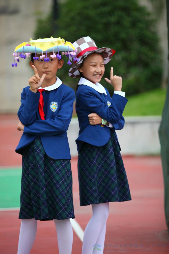 操场上,当老师放起节奏感十足的音乐时,孩子们欢快地跳起帽子舞,自信洋溢地走起了Hat Fashion Show,用地道的英文互换起帽子来,玩的不亦乐乎。