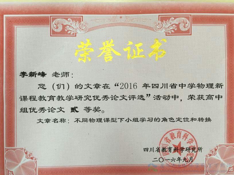近日,由四川省教育科学研究院主办的2016年四川省中学物理教育教研优秀论文评选活动圆满结束,我校高中部物理教师李新峰撰写的《不同物理课型下小组学习的角色定位和转换》一文斩获全省二等奖的佳绩。
