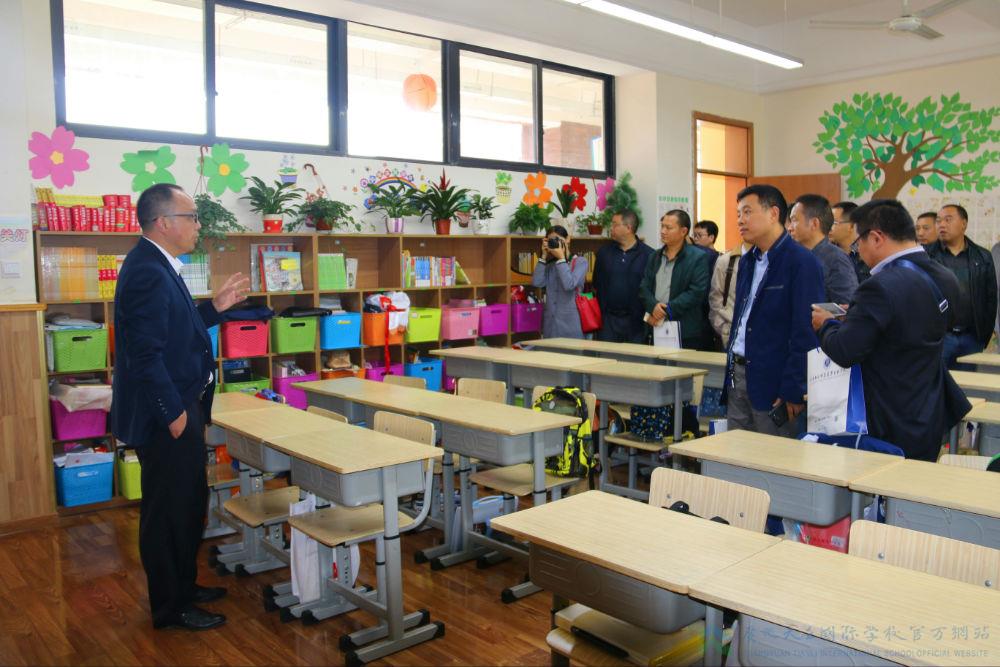 上午,俸耀旭校长带领来自四县三区的60位校长先后参观了学校的基本建筑,对学校的教学设备设施做了介绍,随后校长们到了教室,听评李洁老师、陈凤娟老师的趣味英语与思维数学的课堂教学,并参观了教室文化以及寝室文化。