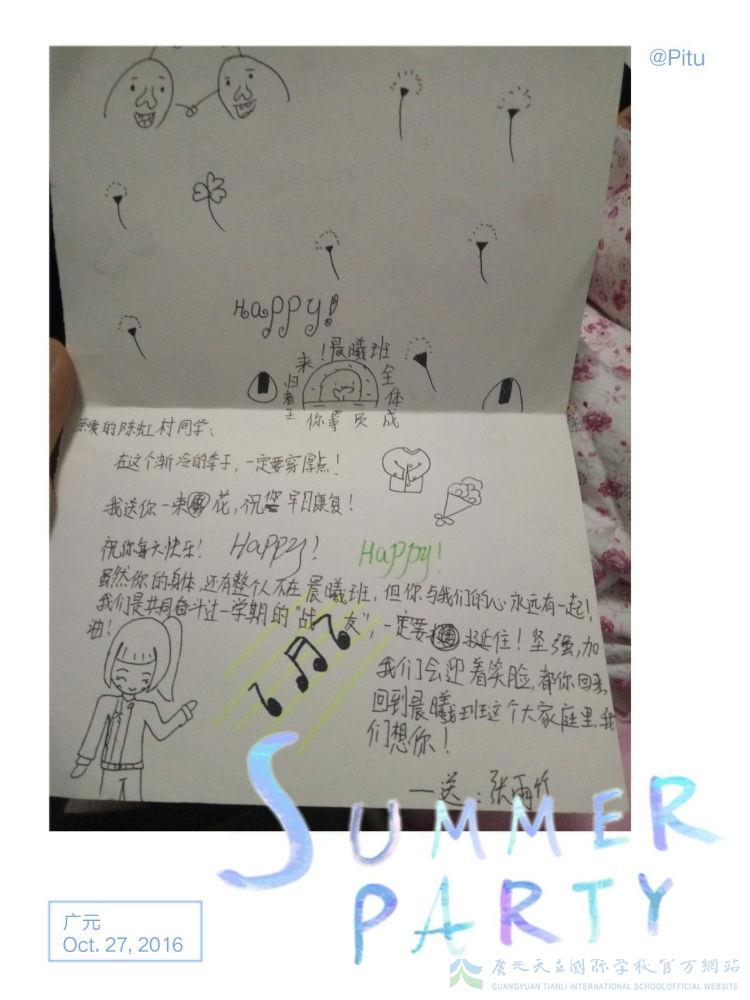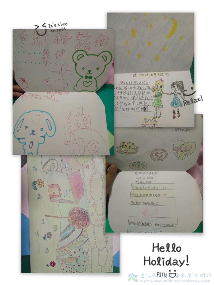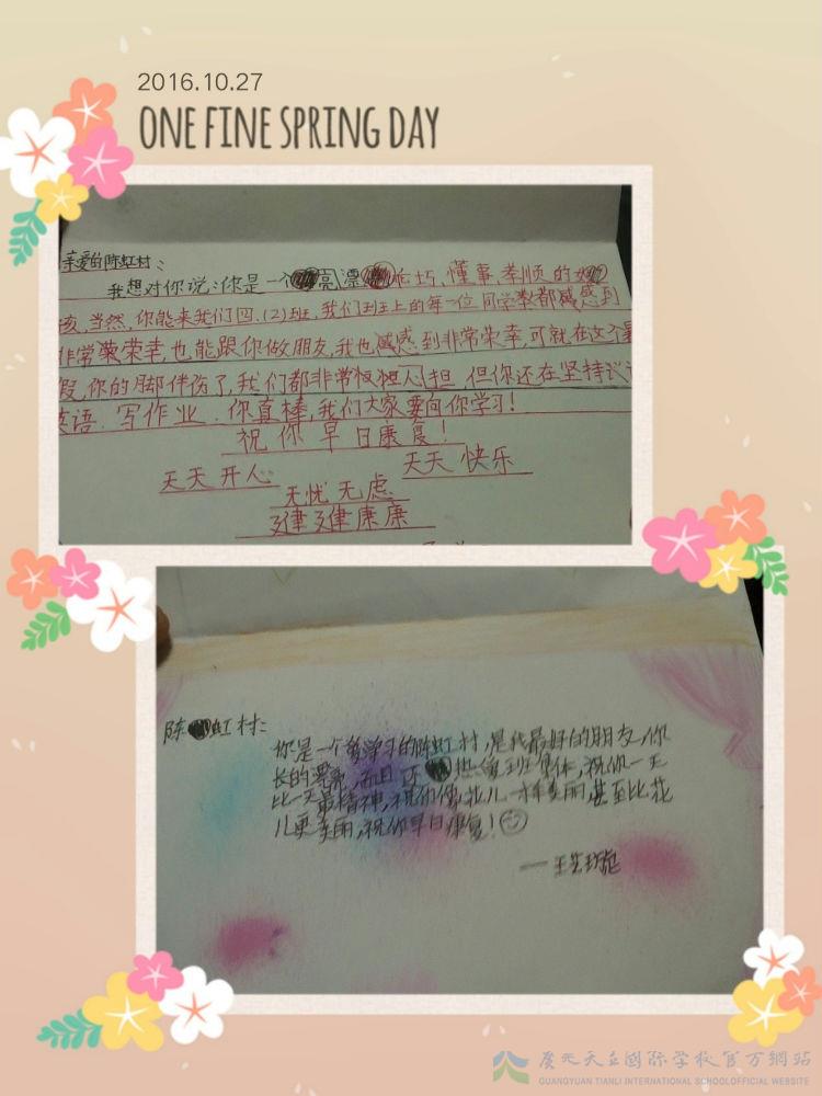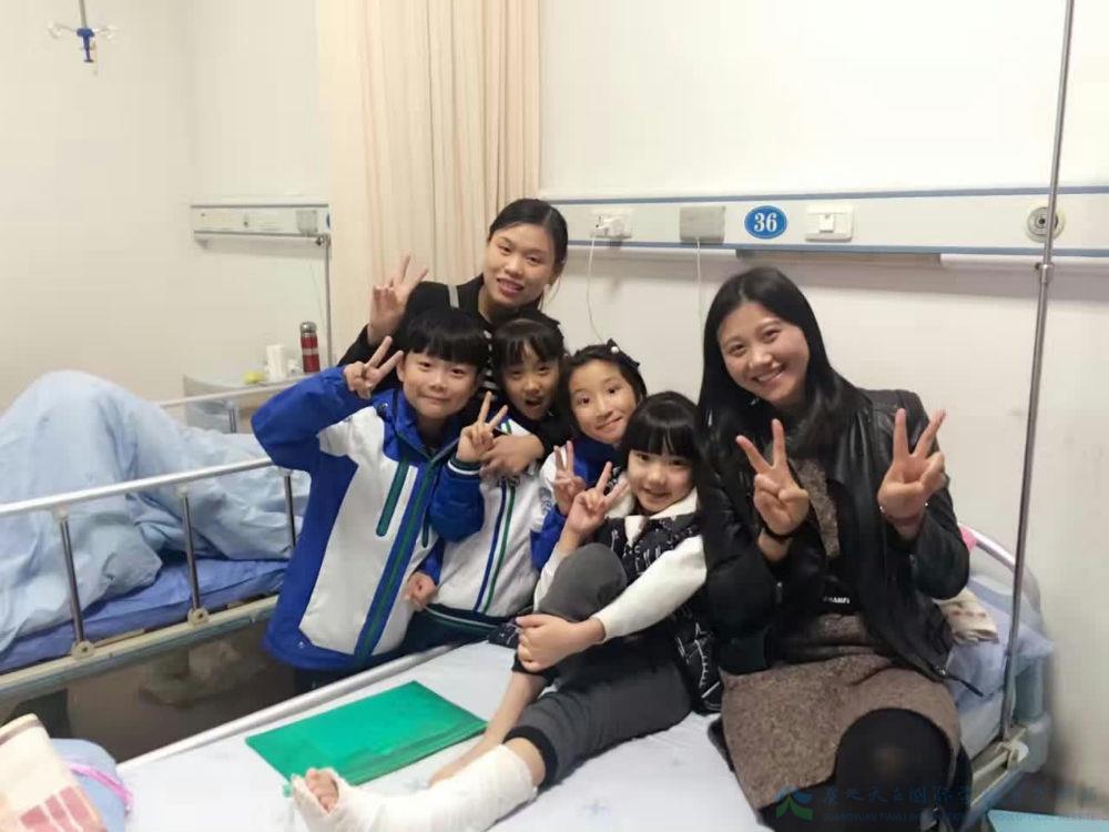 前几天,因为去医院做第二次手术所以有一周多没来上课,班上的其他孩子一直在问老师她在哪个医院,说他们想去看看。在孩子的一再恳请下,上周四晚,刘老师、龙老师以及三个同学代表带着全班同学亲手制作的带着满满爱意与鼓励的贺卡来到医院看望了她。见到老师和同学的小虹村,脸上是藏不住的喜悦。看到同学们亲手制作的各种贺卡,更是感动不已。小虹村说她要快快好起来,早日回到学校,早日回到晨曦班这个温暖的小家,早日和同学们一起玩耍,一起学习。