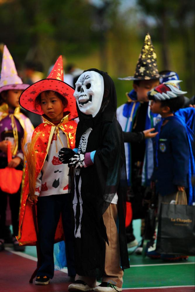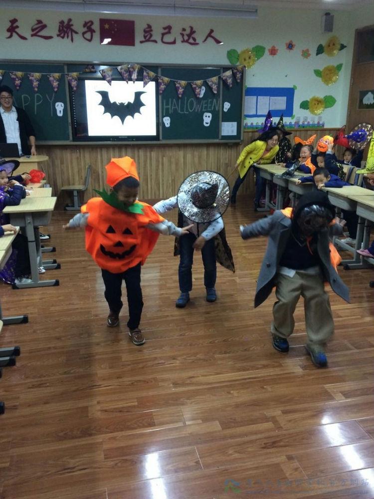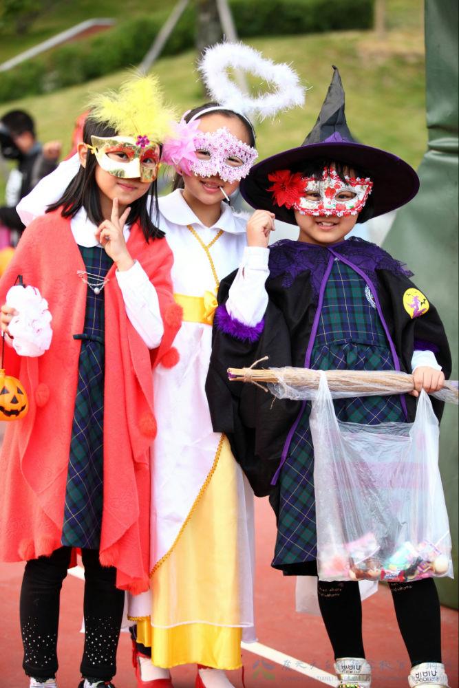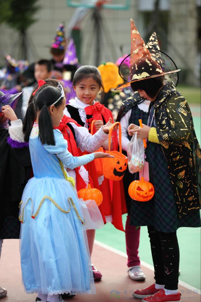 再看看同学们,头戴巫师帽,身穿黑披风,脸上画上了蜘蛛、蛇等许多恐怖的东西。鬼节的气氛可真浓郁啊。随着广播里响起了“万圣节开始啦”,同学们飞快的奔出教室,寻找讨糖的目标。