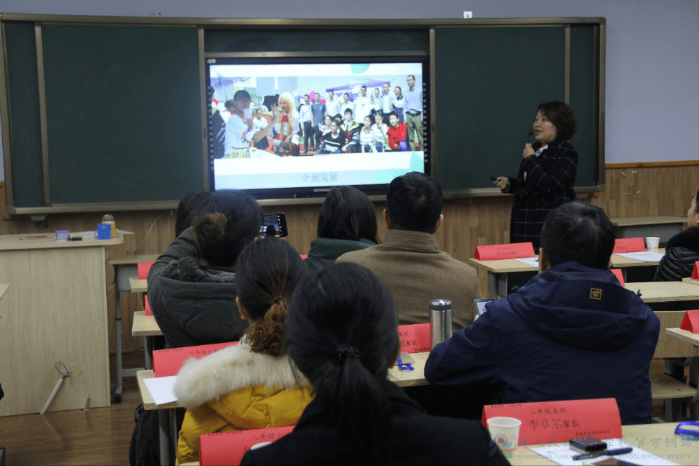 八年级会议由曾雪梅主任主持,她提出我们教育的目的是当孩子离开学校,我们不再用分数、名次去衡量他们的时候,最后留给孩子的品质。接着向家长展示了特色管理模式“一日常规管理——十三大风景线”。最后,分别从家长的认同、认知和支持方面指出八年级家校共育现状的不足和重要性,期望在今后的家校共育过程中做到“共创、共享、共进”,努力推进家校融合,统一认知。
