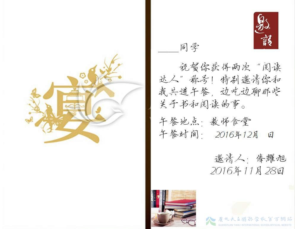 11月28日,俸校在百忙之中对“阅读达人”进行了统计,并发出了正式邀请。我们可以想象,当孩子们和俸校同坐一桌,而且地点是在教师食堂,会是多么的开心和自豪!如果不是考虑到聚餐的时间不方便统一安排,俸校原本是计划带孩子们到城里去吃真正的大餐的。