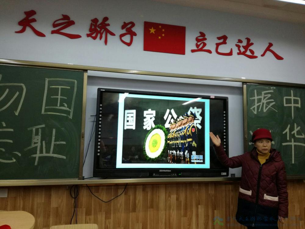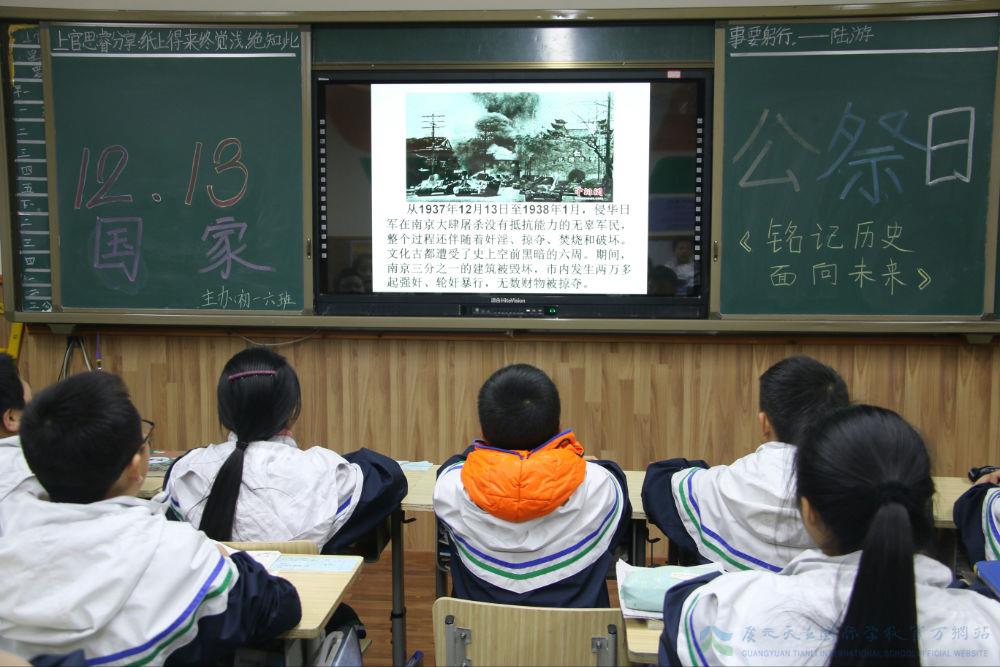 今天,初中部各班进行了国家公祭日主题教育活动,全体同学一起穿越,重回1937年冬天的南京,在PPT中感受了南京中山门、中山陵、南京师范大学以及整个南京城的今貌和79年前的情形,从黑白的照片中了解了以前或许并不知道的历史,从仅存的幸存者的故事中真实体会历史的昨天,从老师的引导中明白落后就要挨打,吾辈必当自强,爱国需从小事身边事做起。