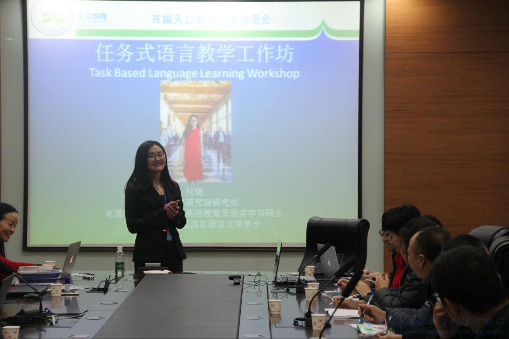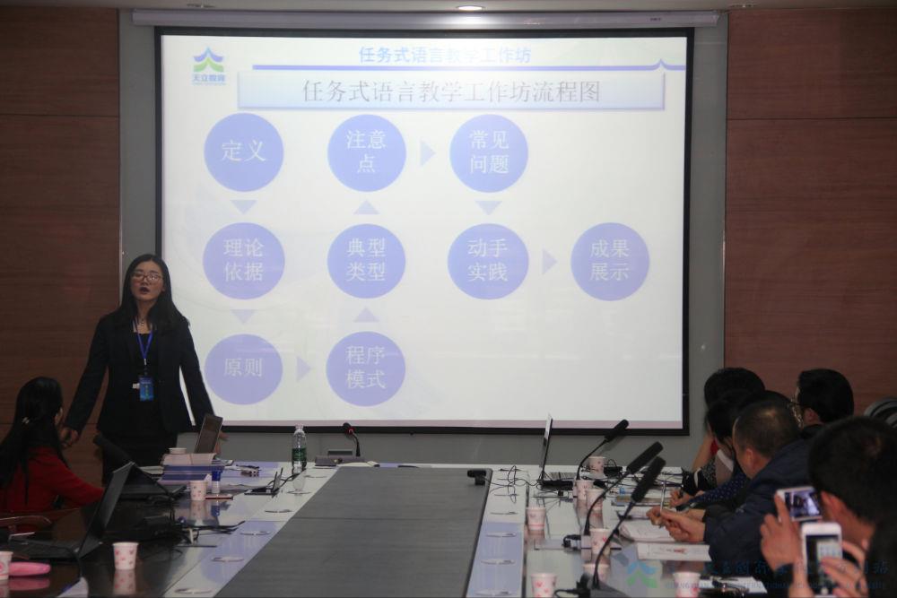 接下来是付晓博士的任务式教学工作坊。四十多个国家的游学经历,不断行走,不断学习,不断总结。她的每一个分享,都是潜心研究,精心实践所总结的语言教学课堂的精华。付晓博士对传统式语言教学模式和任务式教学进行了对比分析,深入剖析了任务式教学的理论依据和操作原理,并详细讲解了任务式课堂的程序。随后,付晓博士组织老师们分小组设计课堂,学以致用。学员们积极讨论,学习激情高涨。