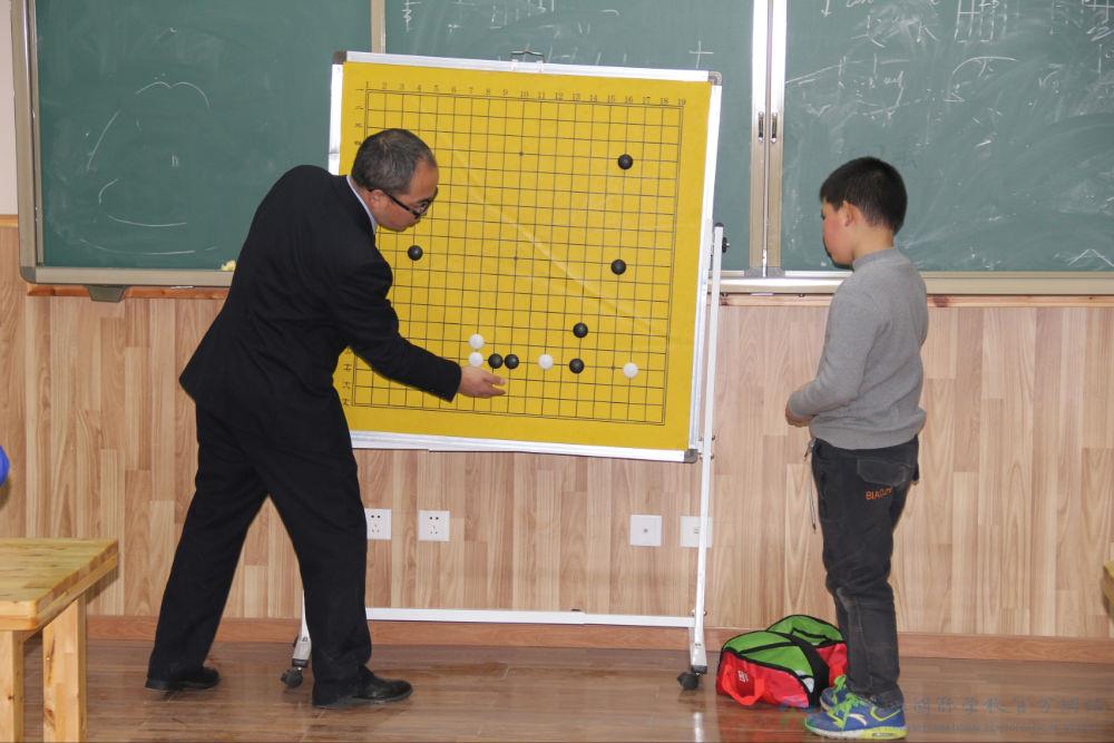 高段围棋“首战”——知心,知礼,知棋,知己,方可静于无形。图为吴绍林秘书长在课前对每一位孩子进行摸底评估。