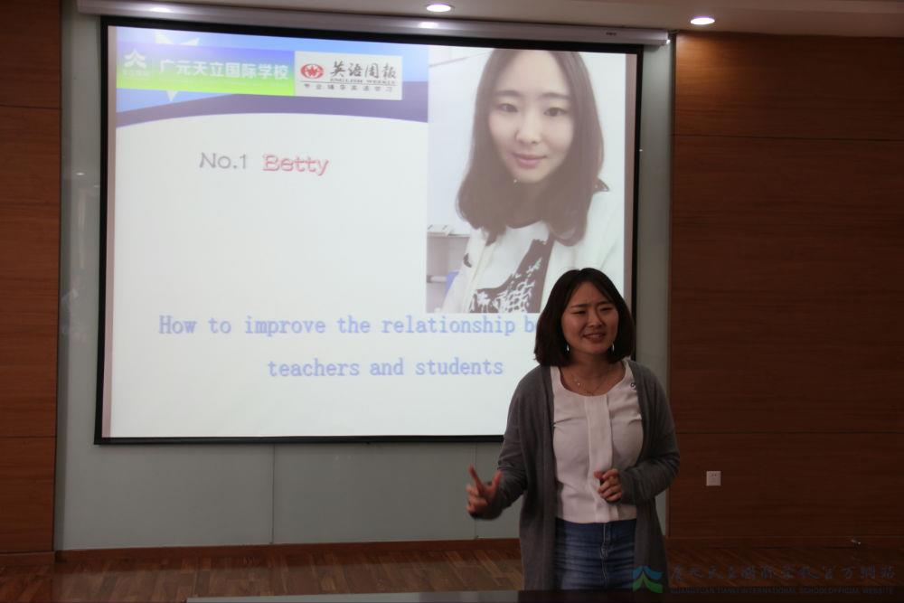 第一位演讲的青年教师是来自四川外国语大学的优秀毕业生杨梦怡老师(Betty),她的演讲题目是How to improve the relationship between teachers and students.