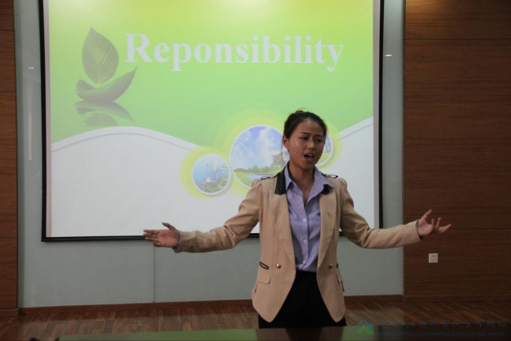 第五位演讲的青年教师是四川省优秀大学生、国家奖学金获得者、初中部优秀教师欧高玥老师(Olyvia),她的演讲题目是Responsibility.