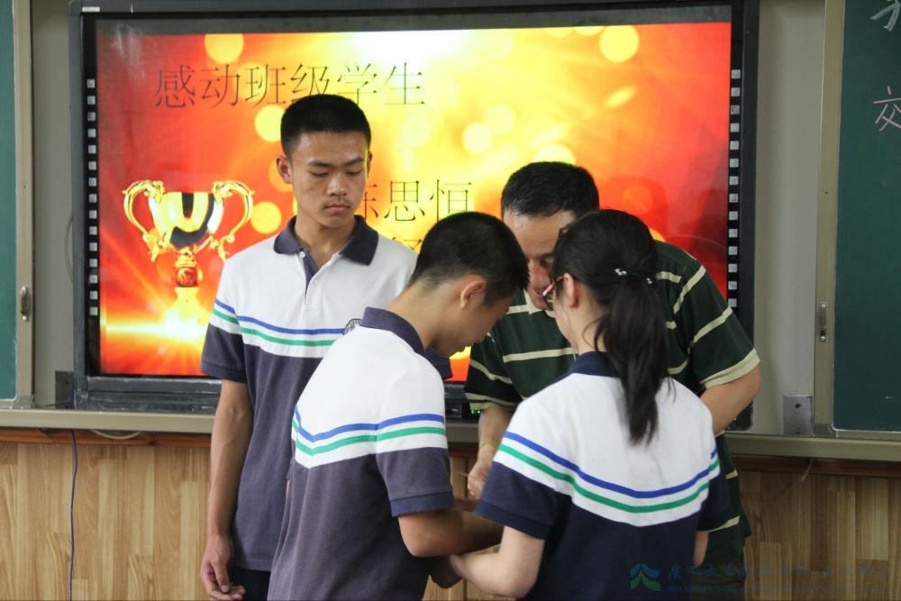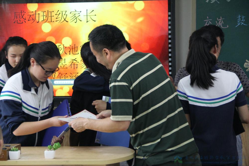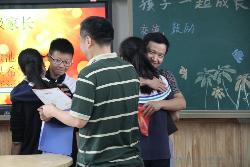 同时各班纷纷一改往日的传统,在表彰感动班级学生和感动班级家长环节,由学生(家长)亲自为自己的父母(孩子)颁奖,并深情朗读自己亲自为父母(孩子)所写的颁奖词。初二8班的庞秋池同学在写给自己爸爸的颁奖词中深情的说到:“世上有一种爱,不能用言语去表达,却能用心体会!当我迷茫,是他的爱给了我力量,让我不再彷徨”!父母之爱子,则为之计深远。朴实的话语,蕴含的却是为人父母者对于孩子无私的爱!稚嫩的声音,传递的却是无比的自豪与关心!眼泛泪光的爸爸,唯有紧紧的拥抱住自己的孩子,无语凝噎!伴随着阵阵热烈的掌声,在场的各位无不为之动容!