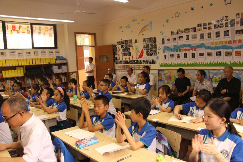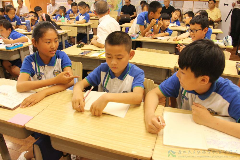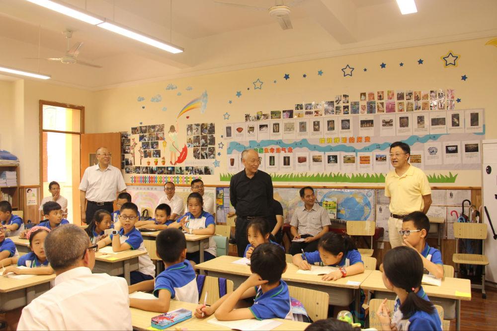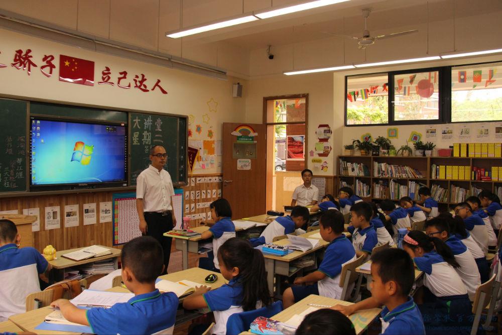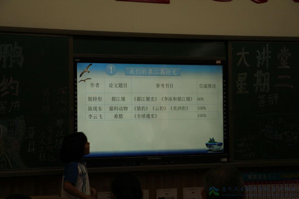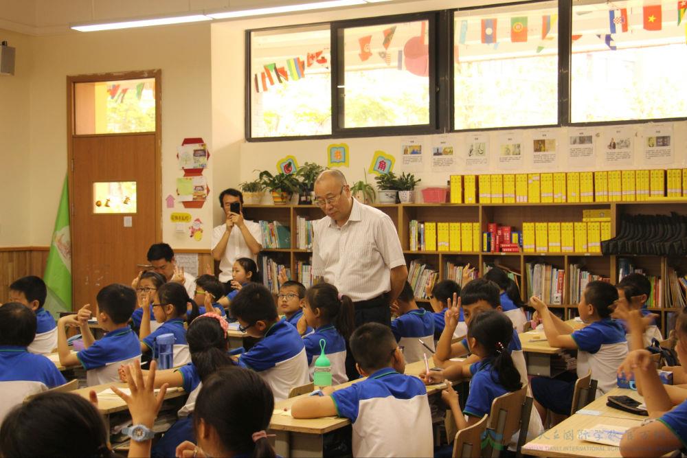 视察完孩子们的课间操,测评小组随即又参观了小学部4年级3班鲲鹏班的博物馆教室,走进了舒凯老师的论文课堂,对孩子们的论文报告进行了聆听,并且进行了一系列提问。