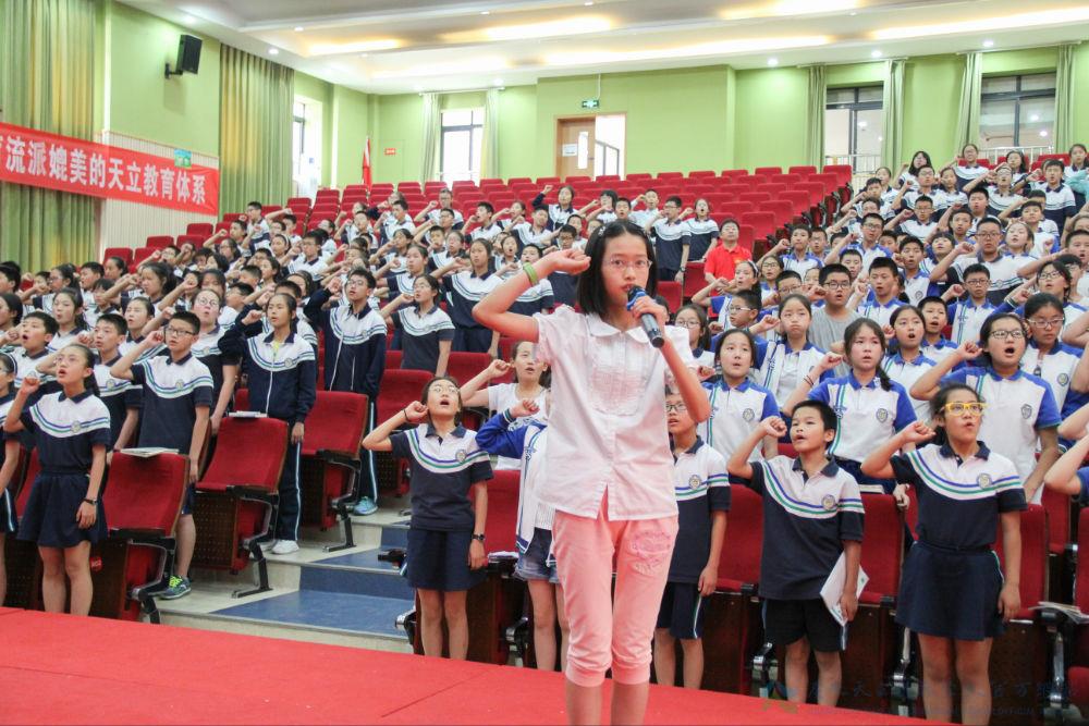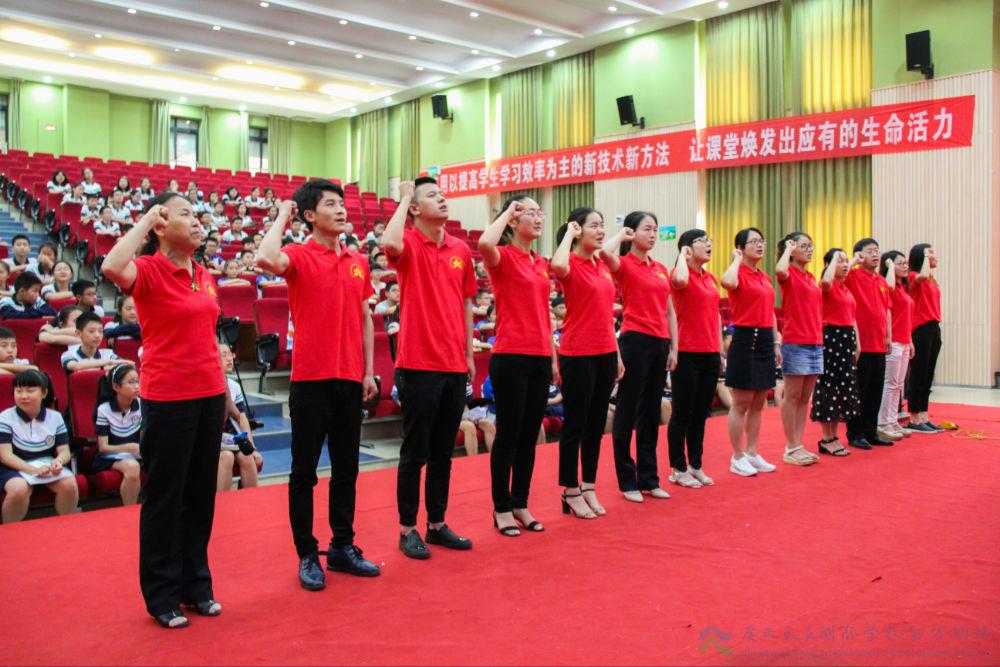 预备年级全体教师上台宣誓,面对着自己用心用情去关爱的孩子们即将走上人生的第一个战场,表明了“我们将和你们同舟共济,我们是你们的坚强后盾”的决心。在场师生深受鼓舞,有的同学已热泪盈眶。