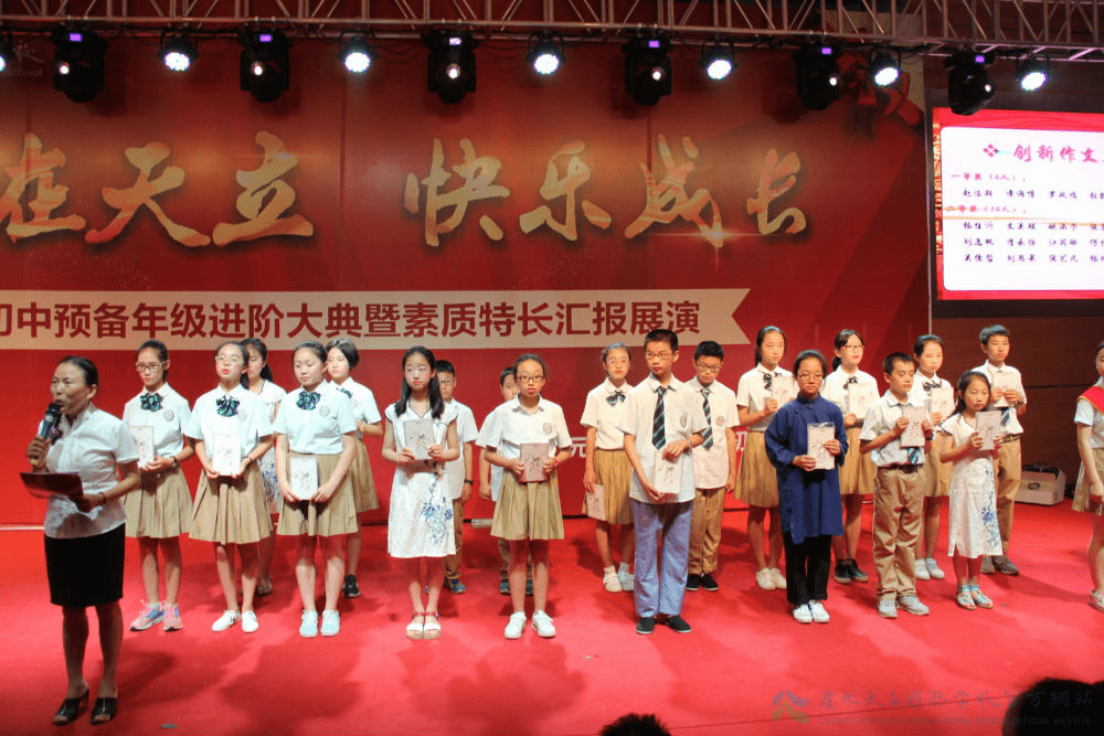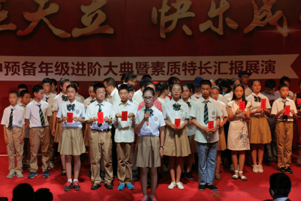 “金碧上青空,花晴帘影红。”在这个荷花飘香的盛夏时节,我们预备年级的孩子在迎来了自己学习生涯中第一个富有有仪式感的毕业典礼。下午一点半,伴着《歌声与微笑》欢快的旋律,初中预备年级进阶大典暨素质特长汇报拉开了序幕。