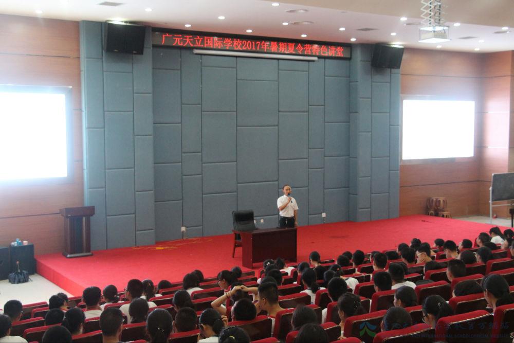 特色讲堂以“看破红尘,让生命唱歌”为主题,分别从“点亮一盏明灯”、“看清生活”、“看清世界”和“看见未来”四个方面对主题进行了完美诠释。张长英老师语言幽默,端庄大方,其讲解方式深受学员们的拥护和喜爱。讲座伊始,张长英老师向学员们详细介绍了夏令营的具体内涵及该名词的背景来源。他说,夏令营(Summer Camp)起源于美国,1861年夏天,一位来自康乃迪克州的教师肯恩,率领孩童进行为期两周的登山、健行、帆船、钓鱼等户外活动,以此来均衡孩童身心的发展。“肯恩营队”每年八月都会在一座森林的湖畔进行,并且此举持续进行了十二年之久。通过过去十多年的营队经验,肯恩得出结论——夏令营是以非常特殊的环境为背景,通过一群训练有素、专业热忱、细心耐心的工作人员来培养孩子潜能的特殊课程,让孩子能在自然环境中关心别人,在克服困境中建立自信,在团队竞赛中与人合作,在学习过程中积累能力。张老师指出,我校夏令营有天立的办学特色,无论是户外课程还是室内课程,都希望同学们能够深刻体会其中的内涵,汲取之中精华,不断充实自己,完善自己。