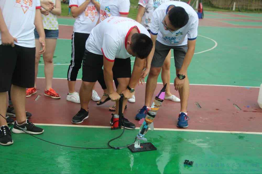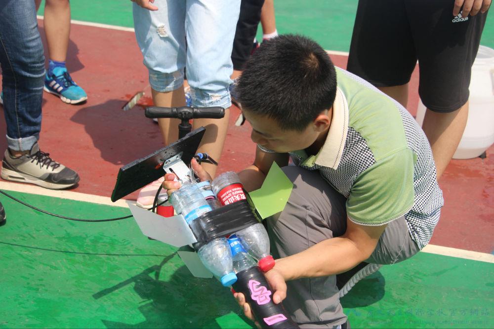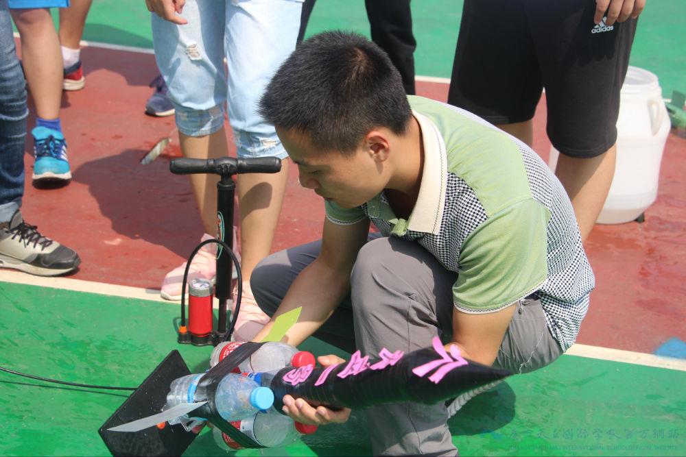 随后,严勇老师组织同学们带着自己制作的水火箭到了空旷的球场上,并亲自做了实验演示。在演示实验中,严勇老师制作的水火箭飞得又高又远,水平距离足有50余米,看的同学们目瞪口呆,纷纷为严勇老师喝彩点赞。在同学们亲自操作时,严勇老师分别对每个小组进行技术指导,并提出了整改措施和意见。通过师生共同努力,绝大多数同学们的水火箭都能顺利发射,更有两个小组的发射距离超过了严勇老师,得到了严勇老师的认可与表扬。