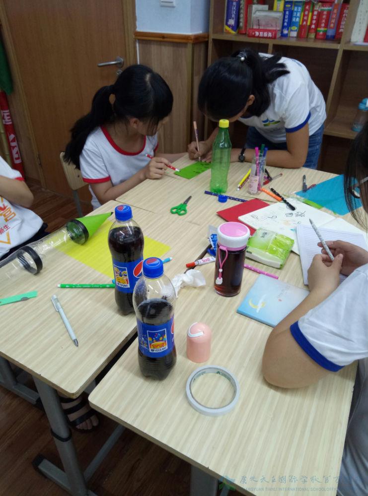 在高中部夏令营开营前期,负责“制作水火箭”课程的严勇老师早早选购了实验器材,同时选购了350瓶瓶装可乐,赠给孩子们饮用,饮用后就地取材,将空瓶制作成水火箭的动力舱和箭体。在课堂上,严勇老师为同学们详细讲解了水火箭的制作原理和发射的原理。他说,试验中我们要用橡皮塞紧的瓶子,形成一个密闭的空间,用打气筒将气体打入密闭的容器内,使得容器内空气的气压增大,当超过橡皮塞与瓶口接合的最大程度时,瓶口与橡皮塞自由脱离,箭内水向后喷出,获得反作用力射出。水火箭和火箭的最大不同,在于其推进的媒介由水变成了高温空气。