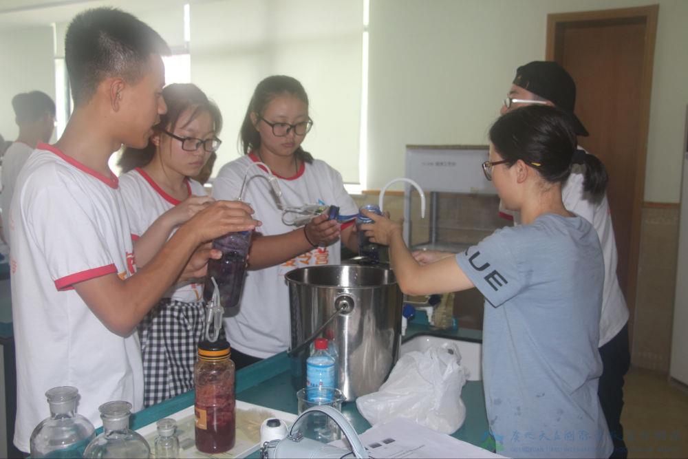 两位生物青年教师在冯华兰老师的指导下,将榨汁机、发酵瓶、恒温培养箱、小烧杯等实验器材有序地摆放在了每个实验小组的实验桌上,并一一为实验小组配发了新鲜紫葡萄。冯华兰老师从“葡萄的挑选”、“冲洗榨汁”、“酒精发酵”、“检测成果”四个方面详细为同学们讲解了实验步骤。她说,选择葡萄要选择新鲜没有破损的,在清洗的过程中不能反复冲洗,不然会冲掉葡萄皮上的酵母菌。榨汁结束后,发酵瓶在分装之前要先用酒精擦洗消毒,并要预留三分之一的空间,为酵母菌的繁殖提供适量氧气。