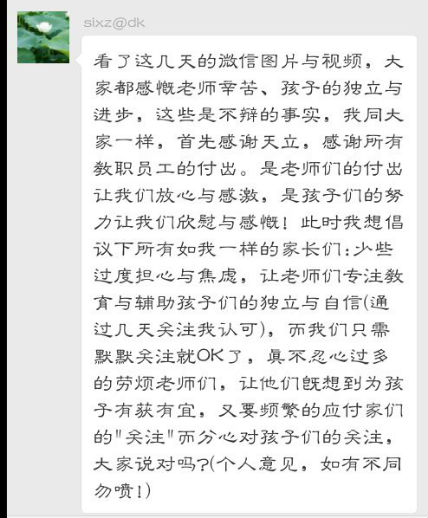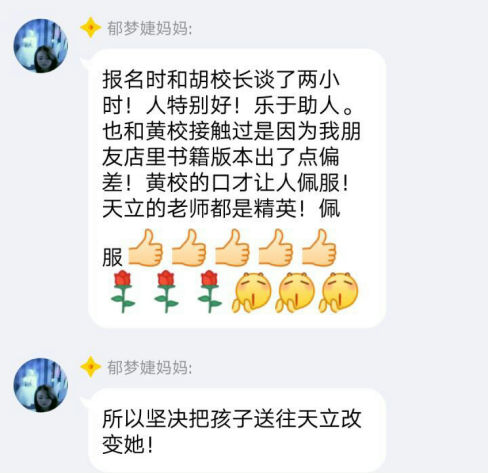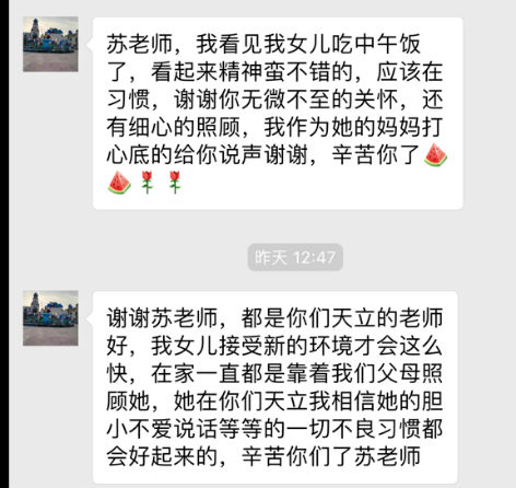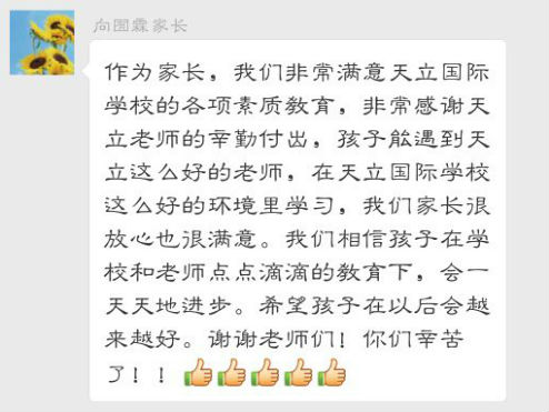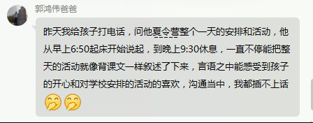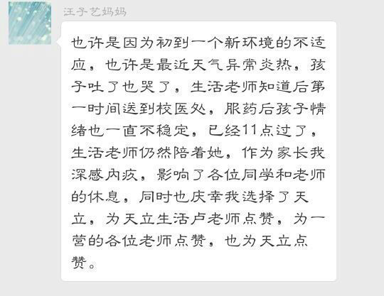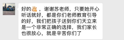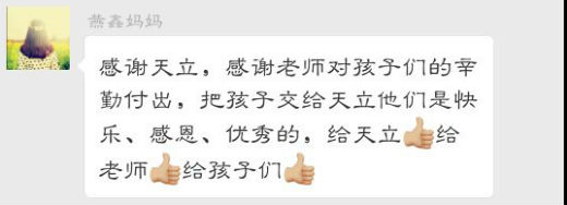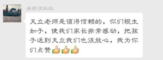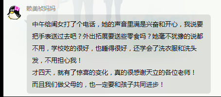 从以上家长之间的交流中我们可以看到,有的孩子任性、依赖性强、不喜欢集体活动,亦或是不懂得感恩,不知父母辛苦,不坚强不自信,作息不规律,独立生活能力欠缺,等等。然而每位爸爸妈妈都希望能和自己的孩子像朋友一样相处,分享彼此的喜怒哀乐,却多多少少因为沟通方式的问题与孩子之间产生了些许隔阂,又或者是爱子心切,事事包办,让孩子少了成长中应该经历的磨练和考验。所以在天立,就不免会让家长们“担心”了。孩子必须学会洗衣服、洗头发、战胜心中的胆怯与恐惧,融入集体,学会分享、学会专注、学会感恩、学会对生活充满热情。而在这里,每个孩子同样是我们手心里的宝,老师拥有和家长一样的心情,因此,家校共育,得到家长的理解与支持就变得尤为重要。