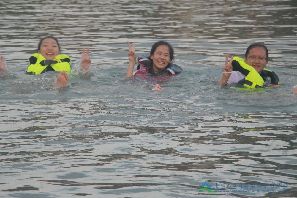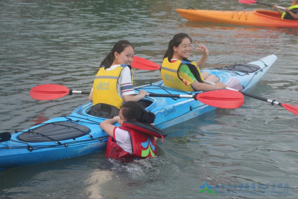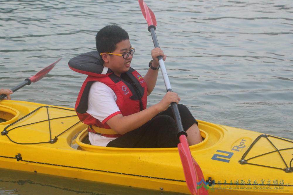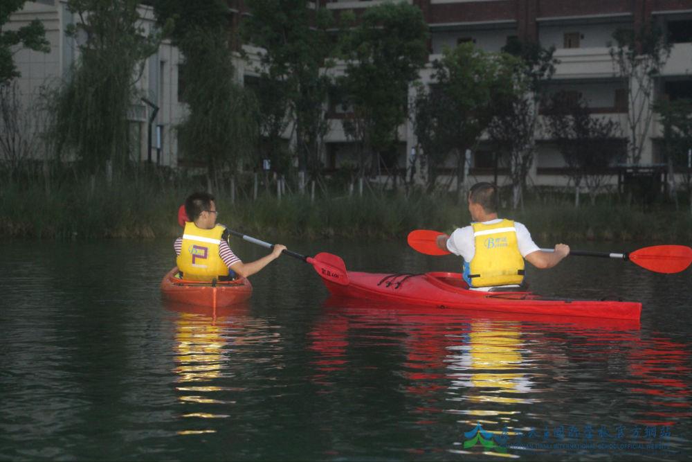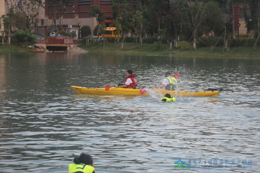 每到日落时分,营员们最期待的就是架着一叶扁舟荡漾在天健湖中,候清风徐来,看荻芦翠影。然而,在第一次课的时候,大多数营员只是在湖畔张望着,上艇的往往都是有游泳经验的。但是,在杨博文老师多次耐心的教导和鼓励下,营员们都渐渐上了艇,双人艇的营员也渐渐一致了划桨的力度和速度。游泳是皮划艇的学习内容之一,许多营员也从畏惧过渡到开始在水中嬉戏,到现在只剩下兴奋,在兴奋中“清凉一夏”。