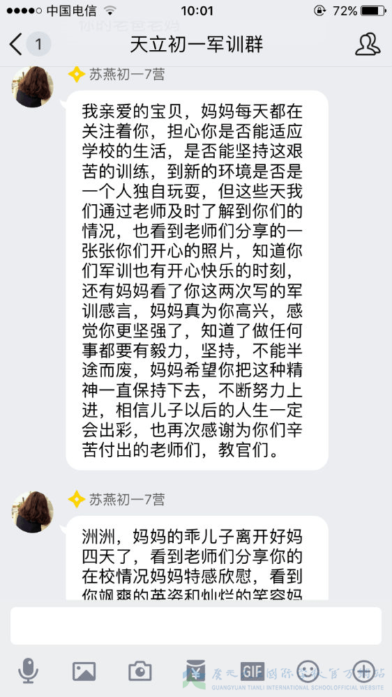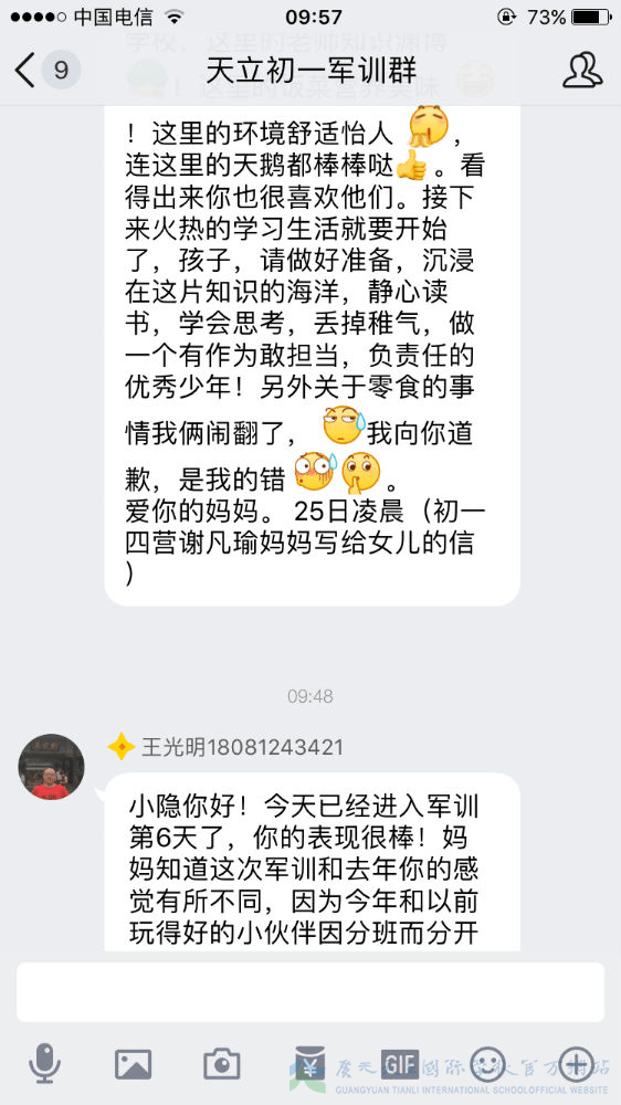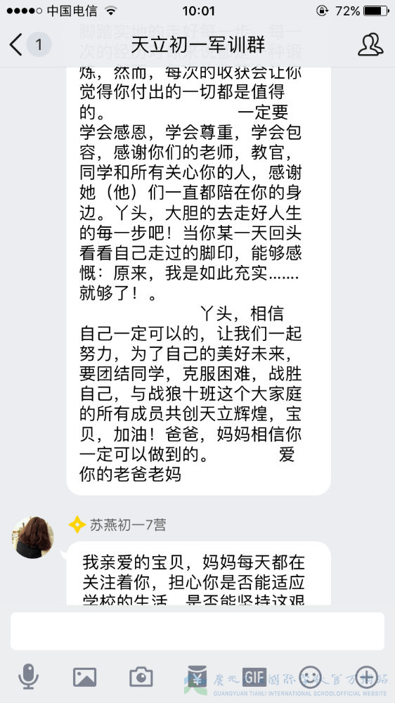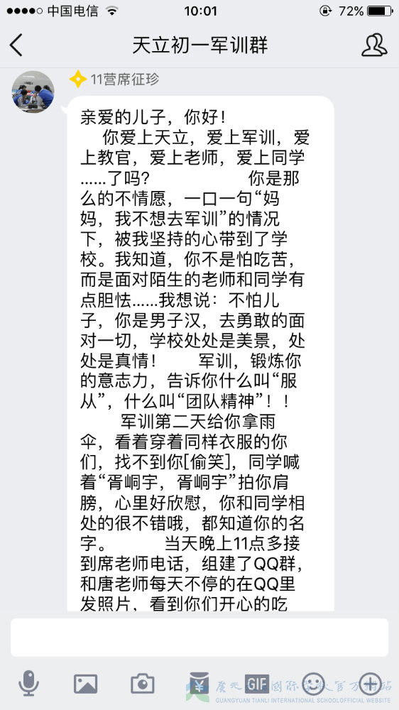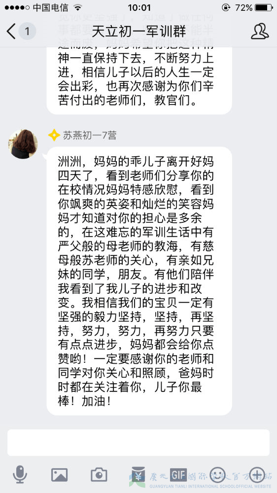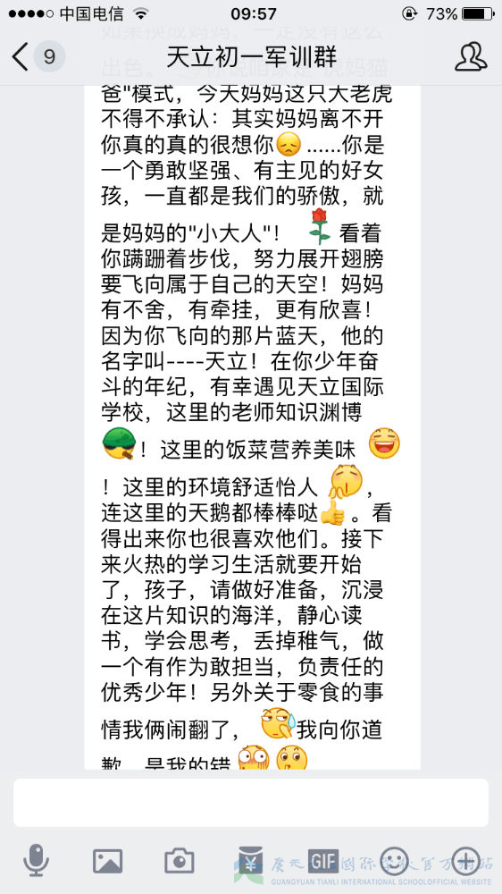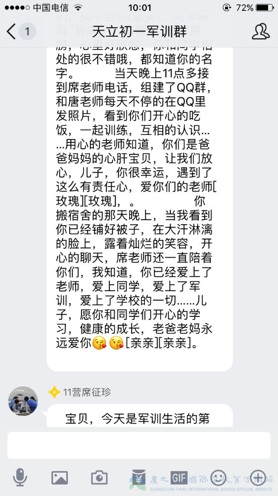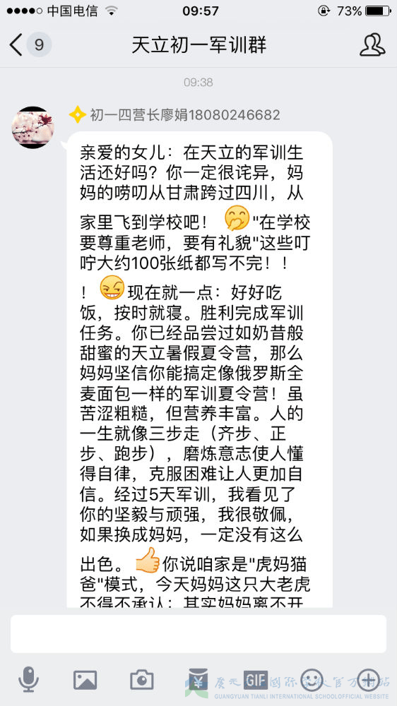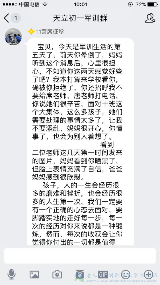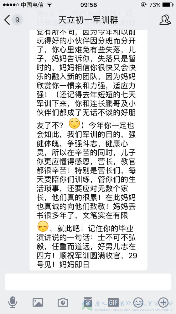 军训已过半,我们的孩子经历了几天的身体考验,那么我们的家长就经历了几天的心理磨难。牵挂、担忧、思念、心疼、骄傲……父母的心时时刻刻为我们孩子而跳动,种种滋味不断涌上心头,难以言语。虽然曾担忧、曾不舍、曾抗拒,但是随着孩子们一天天的进步,家长们按捺住忐忑的心,忍住不舍,放手让孩子们去自由翱翔。因为他们明白,人生有很多条路可以选择,但军训是孩子们必须去走的一条路。这一步很短,一生很长,但这的一步,却是可以让孩子走出孩童期、走出自我、走出自信的重要一步。虽然不能代替孩子去走这一步,但是我们的家长们用文字的方式在后方给予了孩子们最大的支持鼓励。