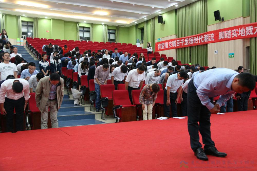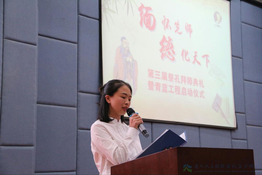 2017年9月28日,是中国著名大思想家、大教育家,儒家学派创始人,“世界十大文化名人”之首孔子诞辰2568年周年的纪念日。沿用古老的仪式,奉献朴素的祭品,以礼为纸,以敬为笔,以心为砚,以诚为墨,祭祀是示敬,是感怀,是追忆。从中华文化的源头走来的祭孔大典,带着二千多年的文化积淀,历经风雨坎坷,伴随着传统文化复兴的节奏,翩翩起舞,已然成为广元天立国际学校一年一度的教育大观。是日晚,广元天立第三届祭孔拜师典礼暨青蓝工程启动仪式在学校学术报告厅隆重举行,全校270余名专任教师以特有的文化方式纪念这位“万纵之圣”,以求真务实、朴素无华的教师“青蓝工程”推进天立人才梯队和人才高地建设。副校长韩顶清主持本次大典。