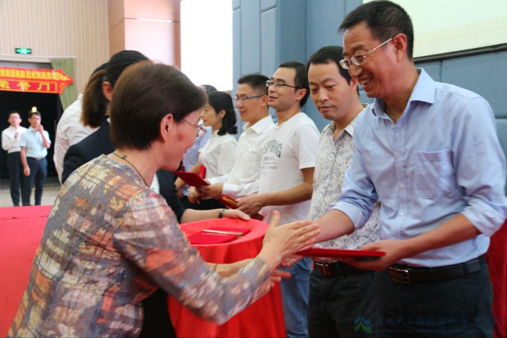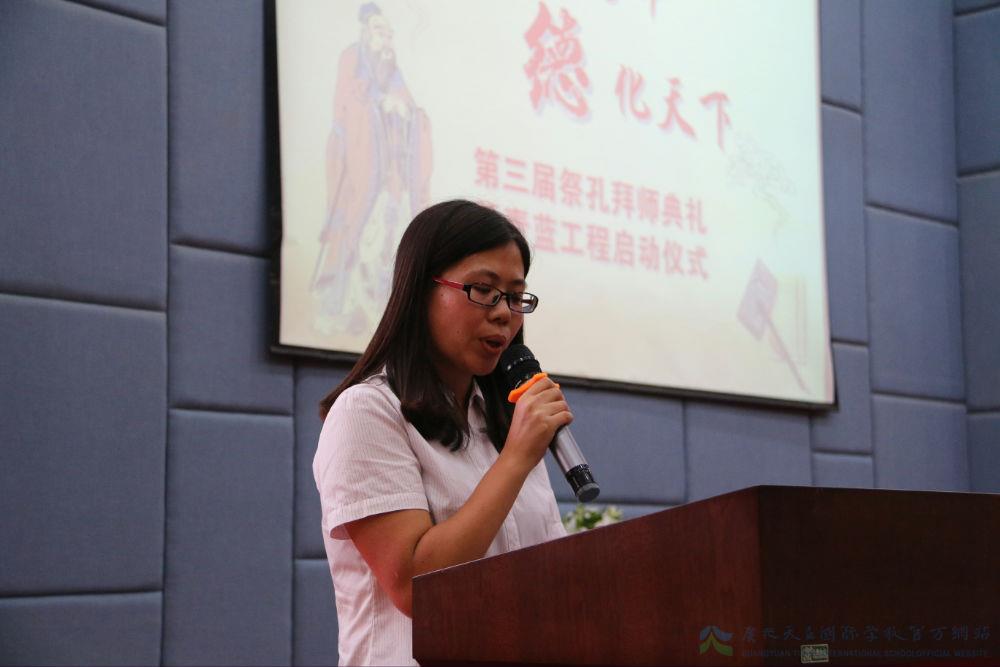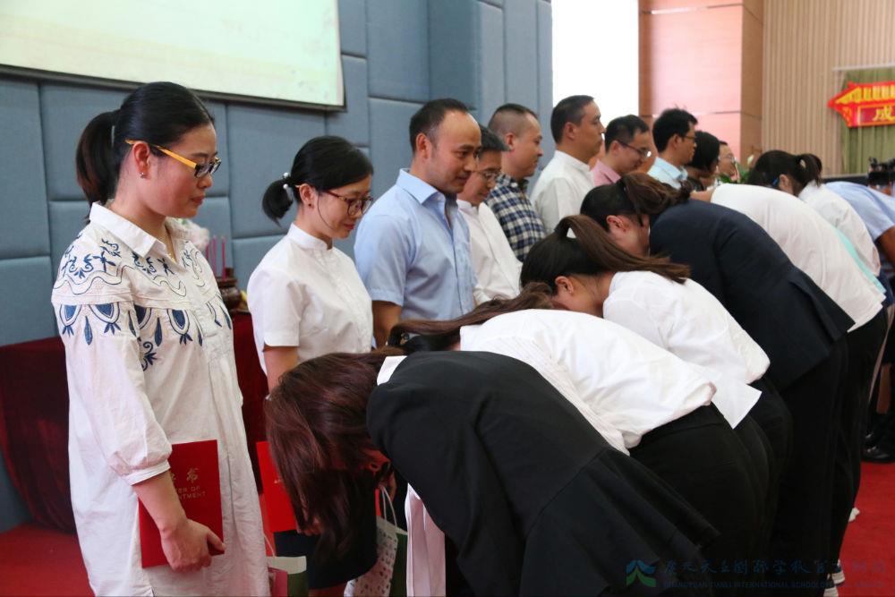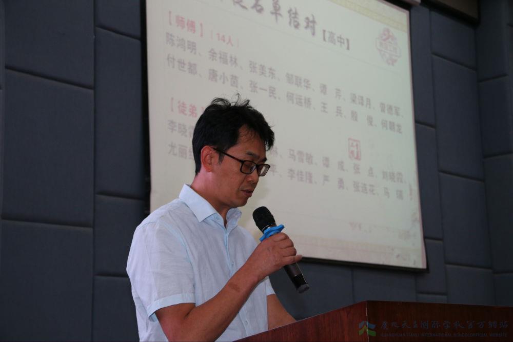 在随后的拜师仪式上,神州天立教育集团首席教师、四川省中学物理特级教师、广元天立国际学校教学质量总监唐明宣读第三届青蓝工程师徒结对名单,来自中小学三个学部的165名学科教师及班主任结为82对师徒,结成学习共同体、教研共同体和发展共同体。