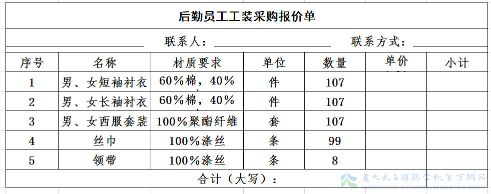 为规范学校管理,进一步加强学校物资采购的监管力度,形成公正、公平、公开的良性竞争趋势,特向社会公开征集员工工装订做供货商,参加“质量、价格、服务”等方面的竞争性比选。公告如下: