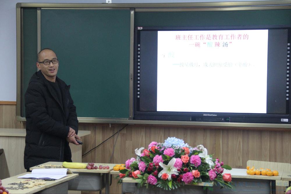 送走班上的孩子和家长,走进504教室,有宾至如归的温暖,不管是鲜花还是瓜果,给班主任们在寒冬里增添了许多温暖。活动开始,伴随着大家的欢笑声,杨英老师声情并茂地献上了张晓风笔下的《我交给你们一个孩子》,初为人母的她,动情更深情。“世界啊,今天早晨,我,一个母亲,向你交出她可爱的小男孩,而你们将还我一个怎样的呢?”
