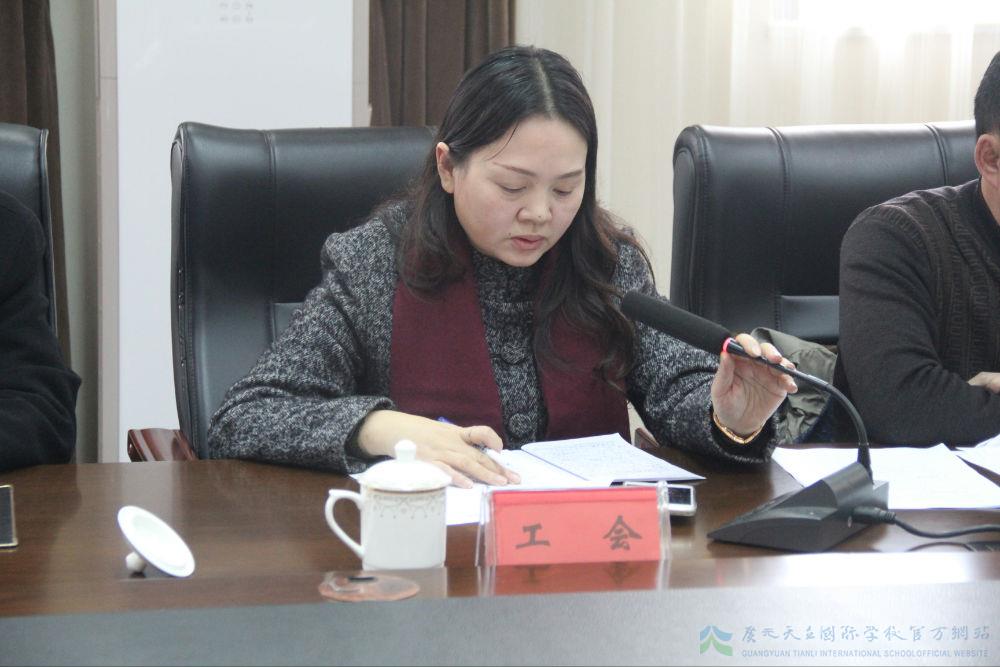 针对学校工会工作,他要求学校一是要以规范有效的工会工作,实现学校的现代治理,构建现代学校管理体系;二是要坚持为教职工保权利、谋福利,构建和谐的天立家文化;三是要坚持工会活动的人文性、丰富性和生动性,不断提高活动的品位和质量。