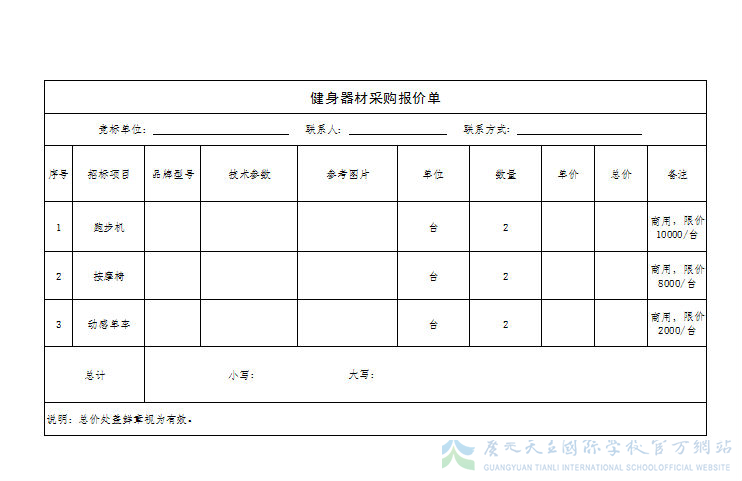 为规范学校管理,进一步加强学校物资采购的监管力度,形成公正、公平、公开的良性竞争趋势,特向社会公开征集健身器材供货商,参加“质量、价格、服务”等方面的竞争性比选。公告如下: