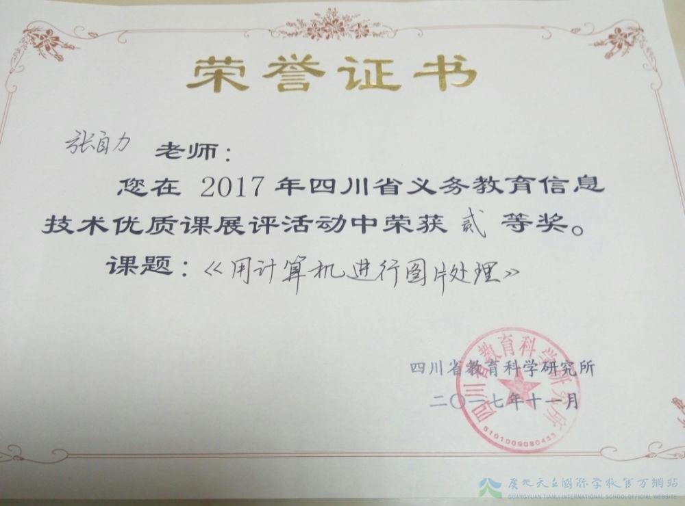 张老师取得了市直属一等奖的同时,又获得了省级二等奖的骄人成绩,这是张老师的骄傲,也是天立学校的骄傲,更是广元市信息技术教育的骄傲。相信广元天立学校还有着许多像张老师一样优秀的教师,祝愿天立的明天原来越美好。