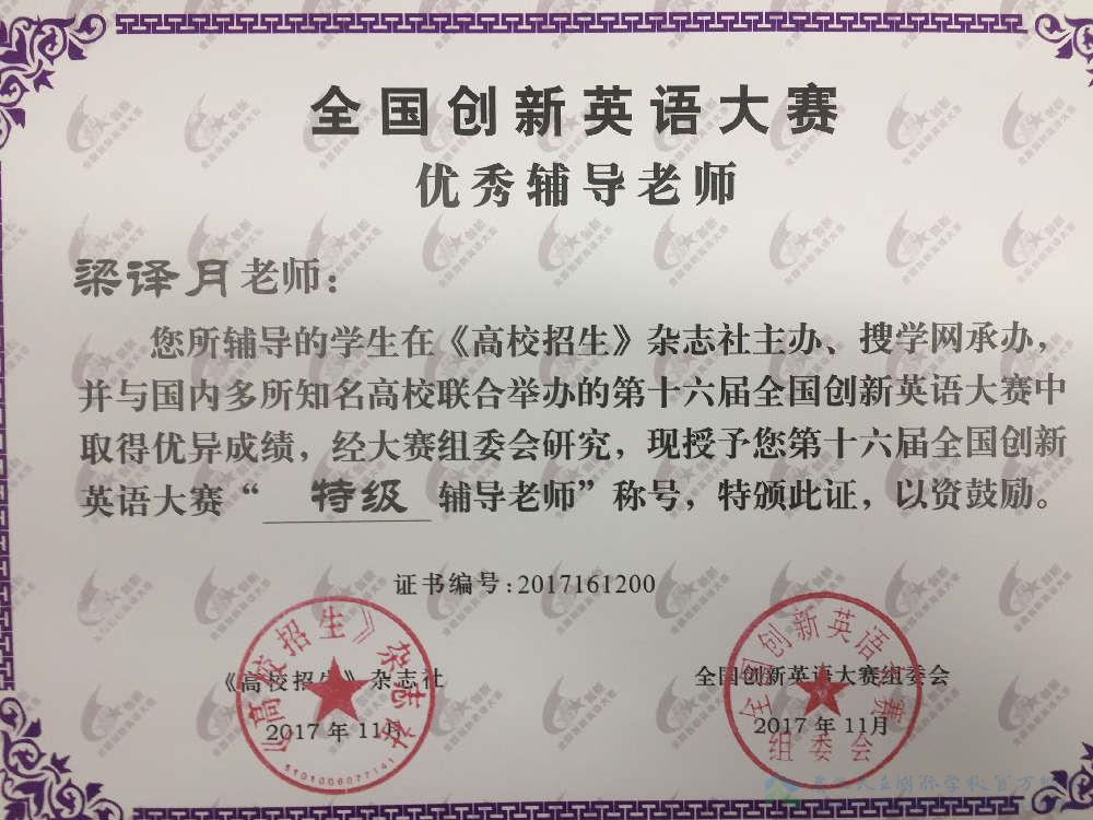 近日,第十六届全国创新英语大赛圆满落幕。我校高二年级3班学生孙亦谦凭借扎实的英语功底和出色的赛场表现,得到了大赛评审专家组的高度肯定,荣获全国二等奖,其指导教师梁译月荣获“特级辅导老师”荣誉称号。