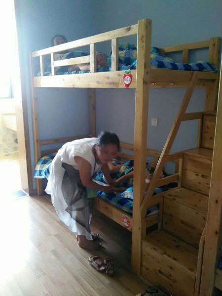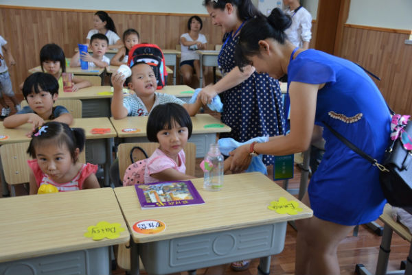 宝贝,乖,把手伸出来,让老师来擦一擦
