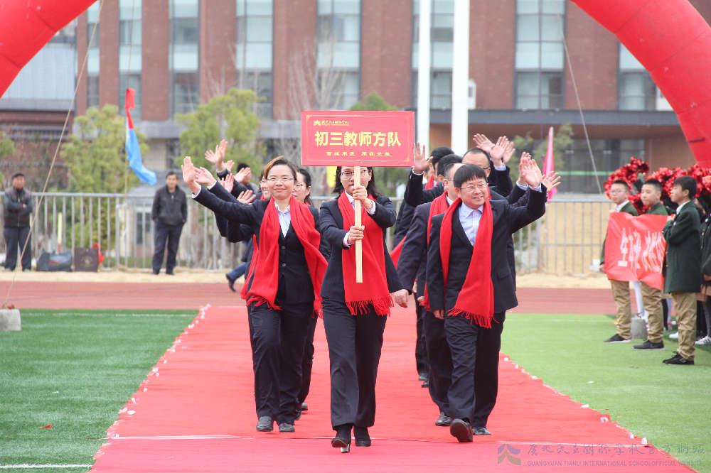 在激越的鼓点和雄壮的歌声中,在初中部全体师生的欢呼和呐喊中,初三年级的勇士们阔步走进“成功门”:“九年磨剑,一朝冲天;拼搏百日,天立夺冠”……一声声震耳欲聋的口号喊出了初三的孩子们对成功和卓越的无上渴望。台下“必胜、必胜、必胜……”的呐喊和欢呼,传达的是全体师生家长对初三勇士的期待和祝福。