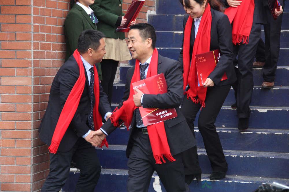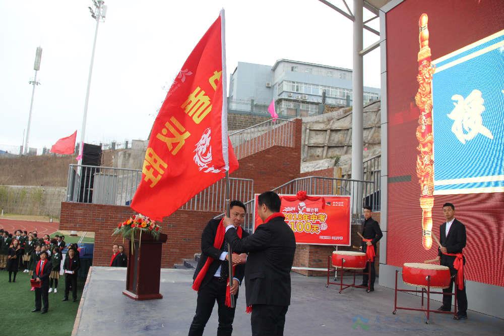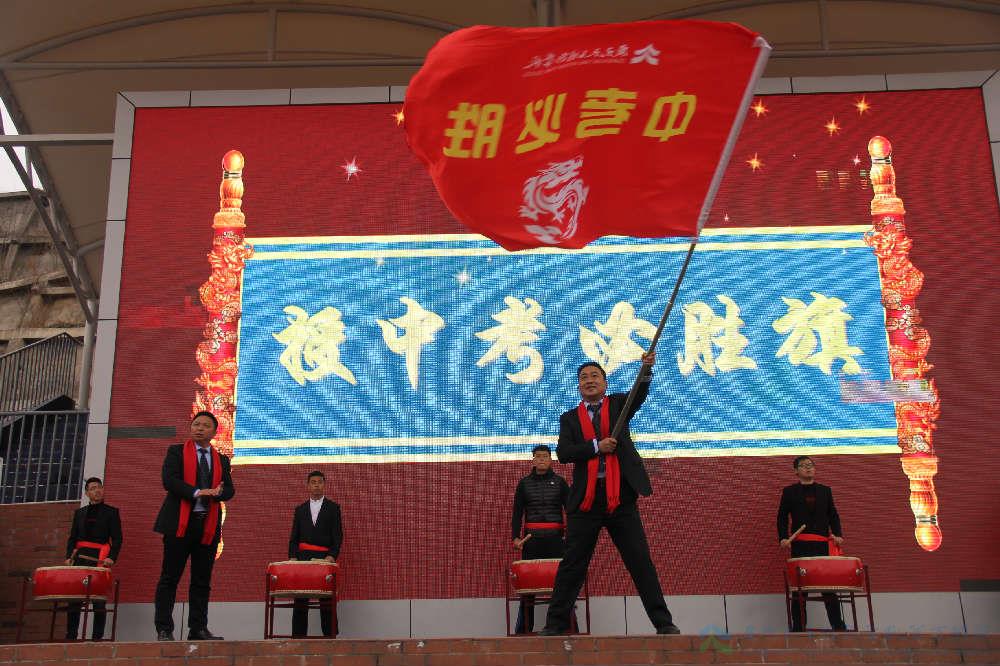 黄永贵校长向初三年级授中考必胜旗,初中分管初三年级李才副校长上台接旗。此刻,鼓声、掌声、欢呼声、呐喊声见证着这神圣庄严的时刻!