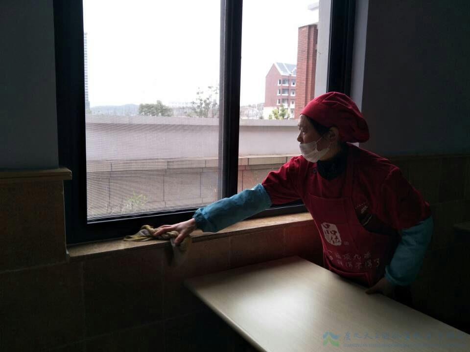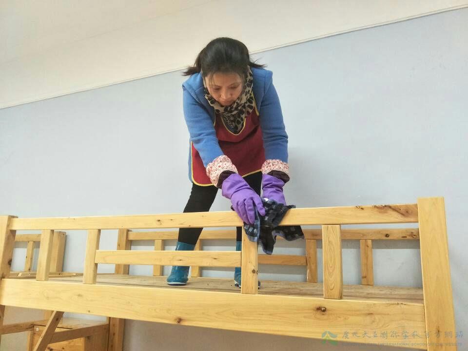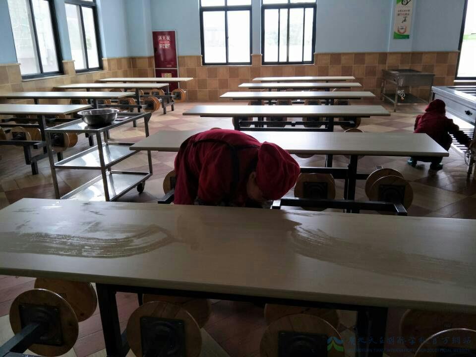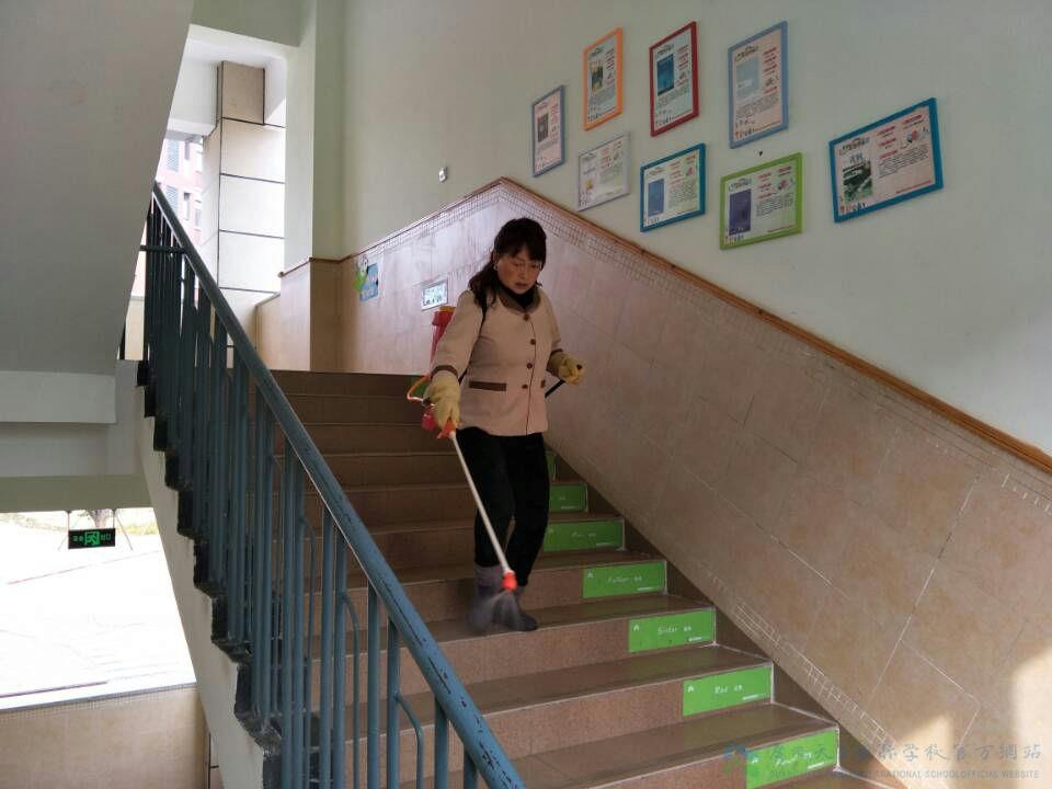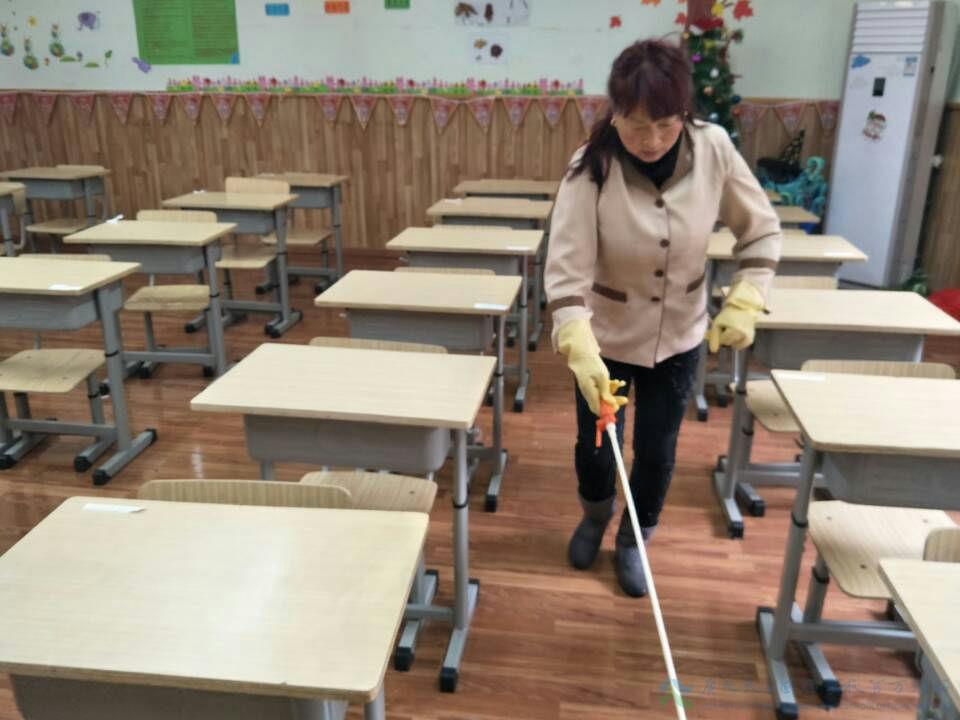 教室、寝室、走廊、卫生间、食堂操作间、餐厅,门、窗、桌、椅、床、扶手、地板等,里里外外、上上下下、方方面面都进行了全面彻底的清洗、消毒,全校呈现了一片洁净清新的面貌。