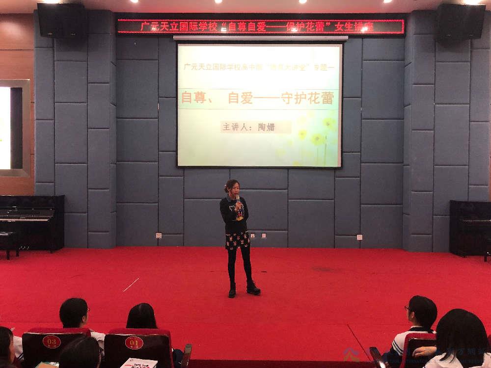 3月27日下午6点20分,在同学们的欢呼之声里,我校高中部针对高一、高二女生开展的题为“自尊自爱——保护花蕾”的女生讲座在学术厅顺利举行。本次讲座由学生发展部陶姍主任主讲,最终圆满落幕。