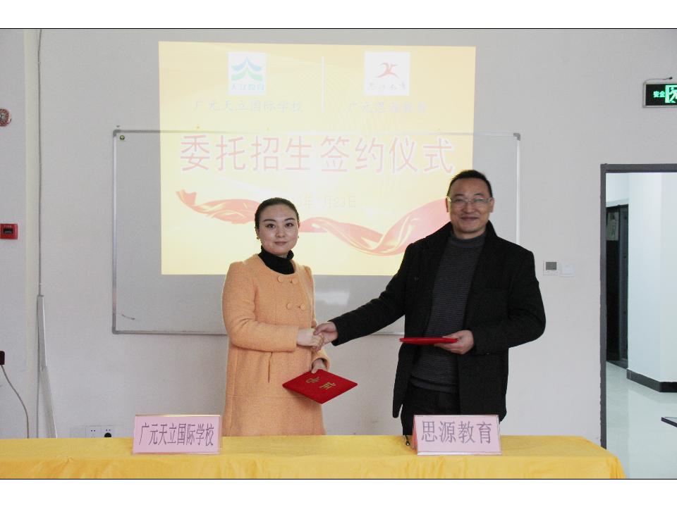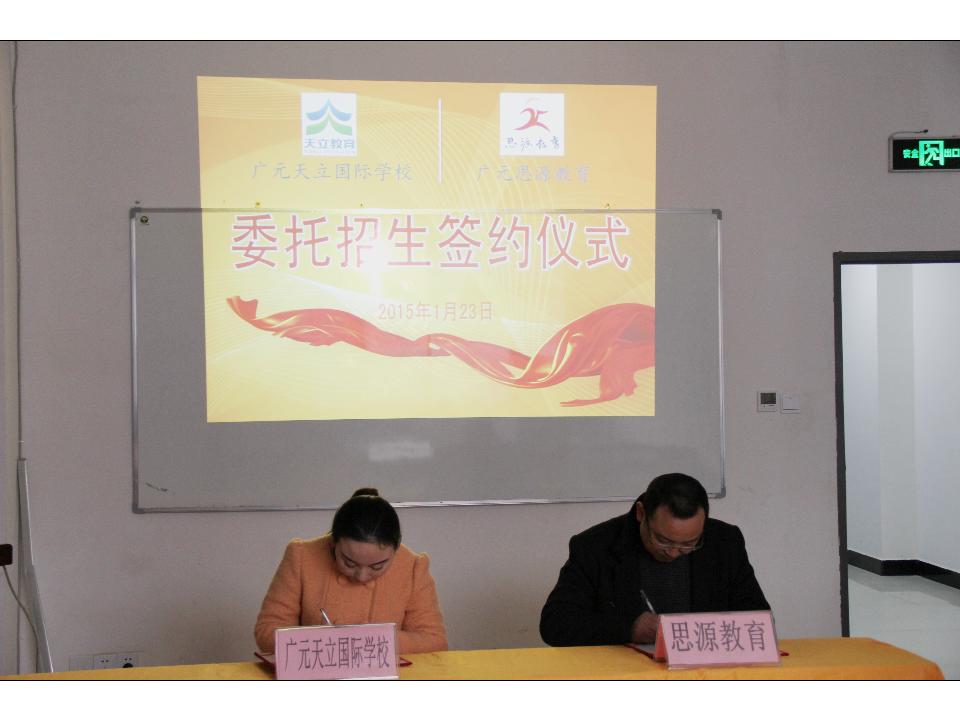 2015年1月23日上午,广元天立国际学校招生组罗婷老师与广元思源教育蒲校长在该校成功举行授权委托招生签约仪式。签约前,双方融洽的交换了意见与想法,并介绍了学校目前情况,蒲校长表示将大力支持我校招生事宜。即日起,也标志着我校在该片区的招生联系点正式启动!热烈欢迎广大莘莘学子到该校招生联系点踊跃报名!