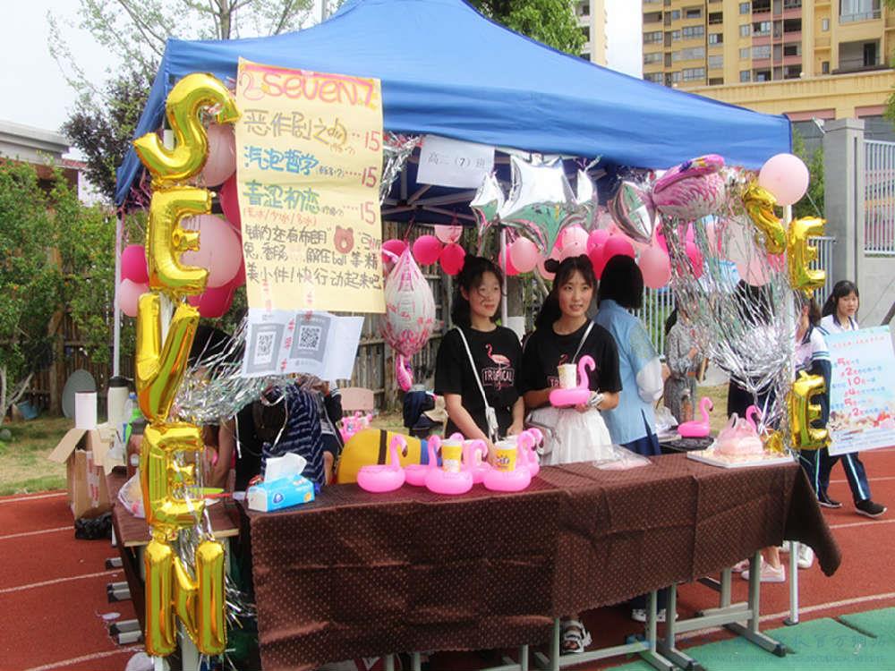只见各个店铺摊位前人来人往,叫卖声、讨价声、呼叫声、欢笑声交织成一片。放眼望去,整个校园人流涌动、摩肩接踵,让此刻的广元天立也多了一道新的风景。文具类、书画类、贺卡类、服装类、饰品类、玩具类、盆景类、水果类、饮料类、小吃类、糕点类,各班批发或由同学自制的琳琅满目的商品让人流连忘返,置身其中恍若来到了繁华的万达广场!欢乐的笑声在荡漾,节日的欢庆在传染!
