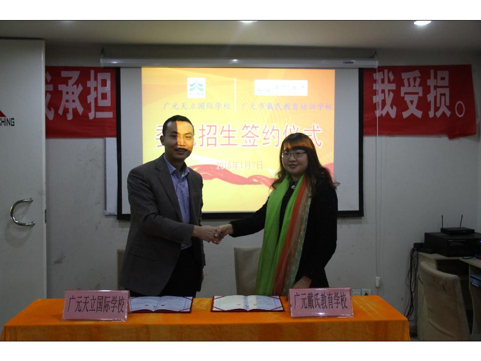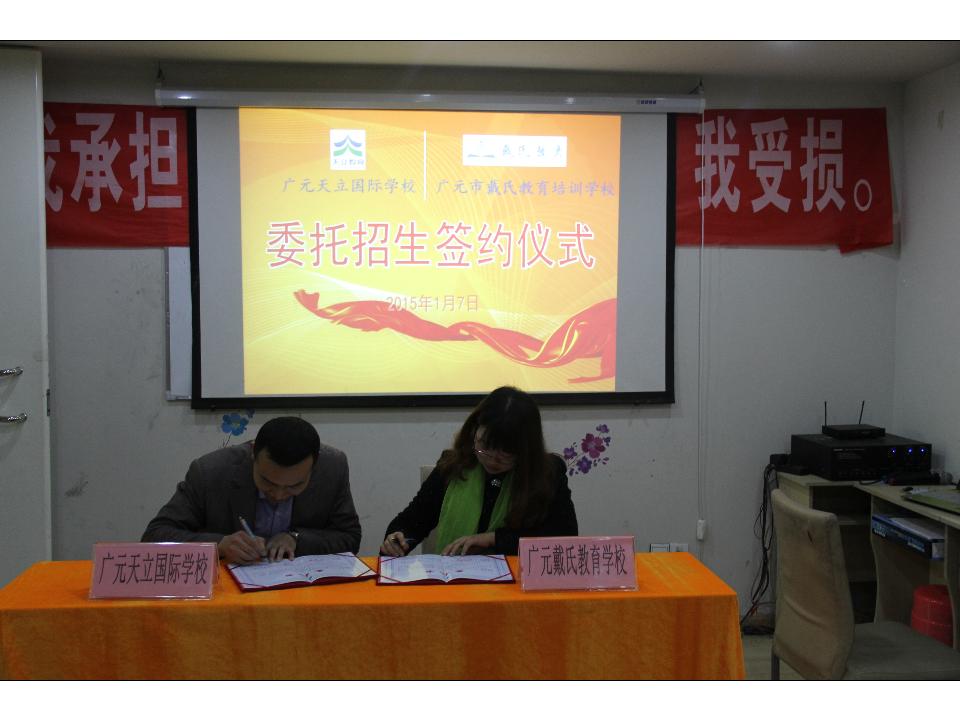 2015年1月7日11:00,广元天立国际学校招生组彭炀坤主任与广元市戴氏教育培训学校程艳校长在该校成功举行授权委托招生签约仪式。签约前,双方融洽的交换了意见与想法,及介绍了学校目前情况,程校长早就期盼广元能拥有一所广元老百姓自己的名校,并表示大力支持我校招生事宜。即日起,也标志着我校在该片区的招生联系点正式启动!热烈欢迎广大莘莘学子到该校招生联系点踊跃报名。