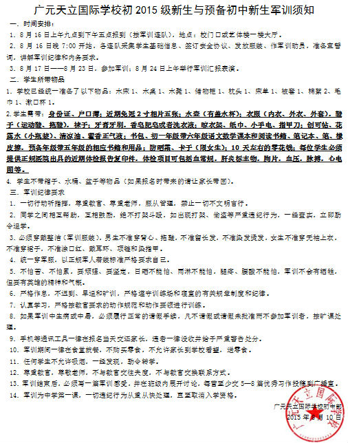 广元天立国际学校关于初2015级新生与预备初中新生军训通知