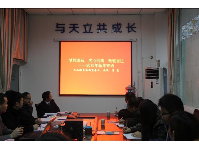 在会上,全体成员阅读了天立教育集团罗实董事长的新年寄语,罗董事长表达了对所有天立学子及其家长、以及天立员工的新年祝福,希望我们继续保持“梦想高远,内心纯明,砥砺奋进”的精神,在2015年的工作中,心手相携,为天立教育的壮大添砖加瓦。