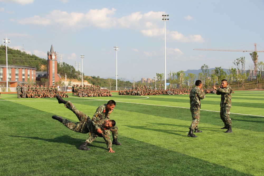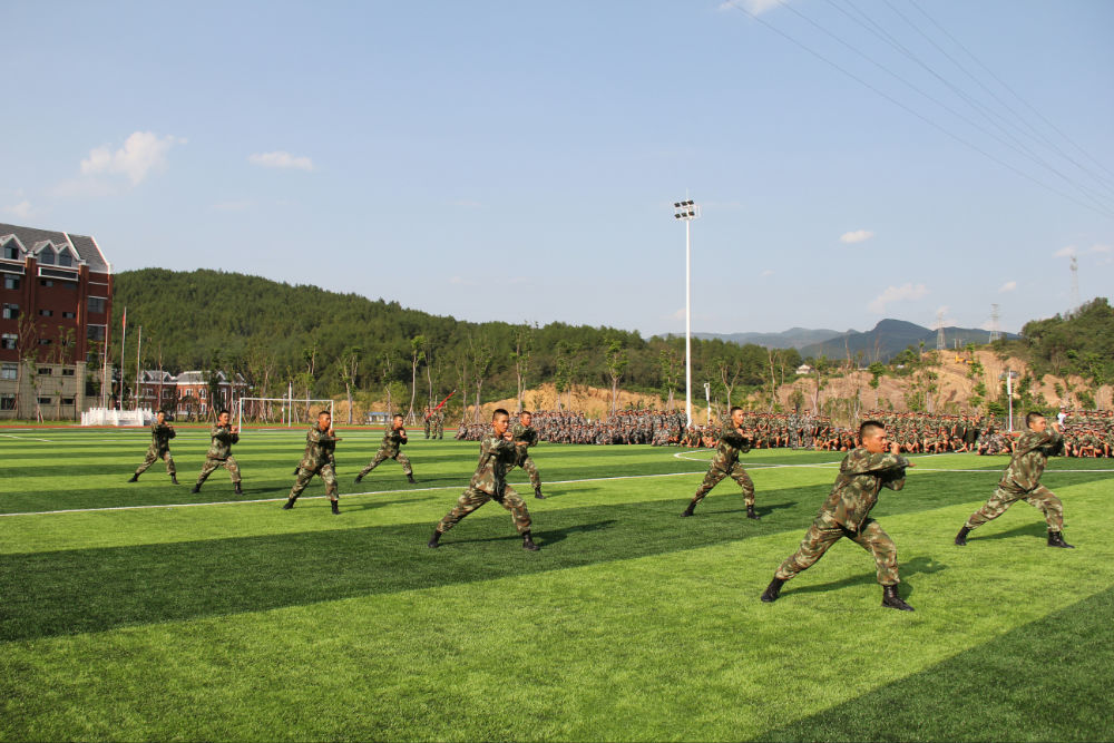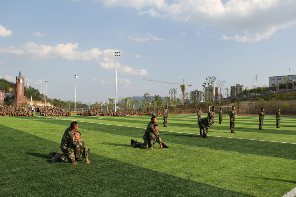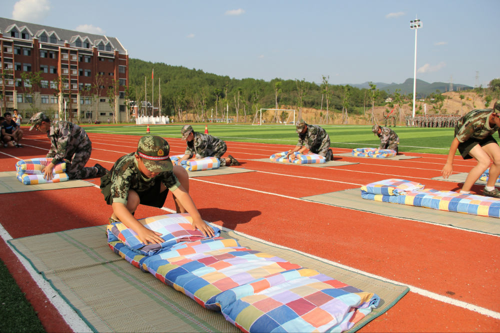 活动在庄严的升旗仪式中拉开大幕。操场上同学们身着统一的迷彩服,整齐列队、号声响亮、军旗飘扬,广元天立国际学校黄永贵总校长在军训总教官的陪同下检阅了各方队。“不怕吃苦,努力学习,为天立争光”!同学们精神饱满、洪亮的口号如春雷乍响,似惊涛拍岸,回应了校长的问候,迸发出了他们胸中的无限豪情。分列式表演中,伴随着激情澎湃的《解放军进行曲》,各方队迈着整齐的步伐,以高昂的士气依次走过主席台,接受领导的检阅。常规训练展示中,同学们以军人的标准进行了集合、四面转法、起步变立正等规定动作,天立学子的蓬勃朝气在此刻得到了完美彰显。内务整理中各个选手当着全体师生和家长的面,按军人的要求将被子叠成豆腐块,伸平、折叠,一招一式中规中矩。期间,高一学生方队还进行了军体拳展示,初一学生方队进行了拉歌比赛,各方队进行了激情跑操,军训教官表演了擒敌拳,学员和教官们表现出来的高昂斗志、过硬素质和严明军纪赢得了现场观众的阵阵掌声。