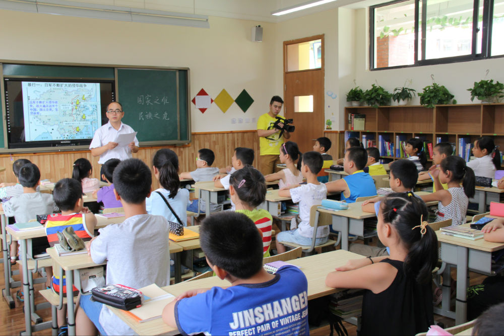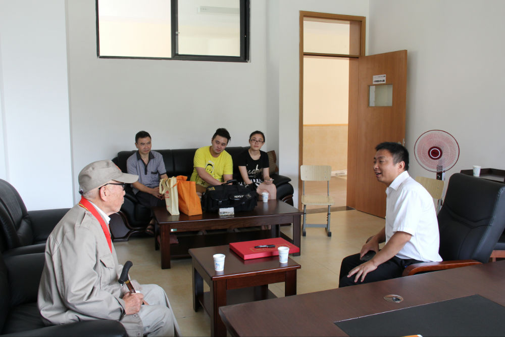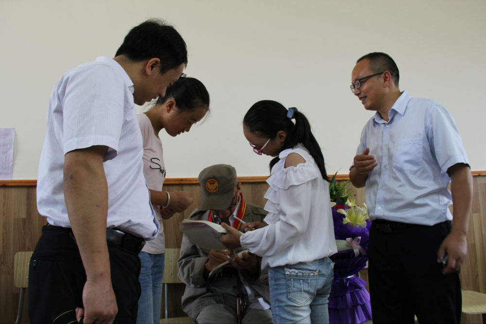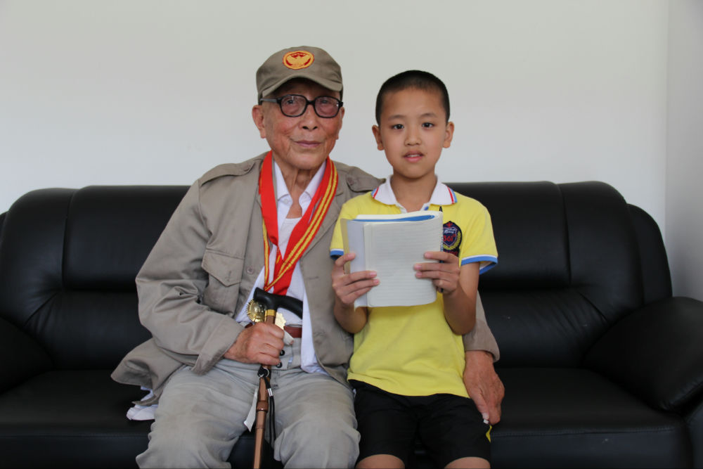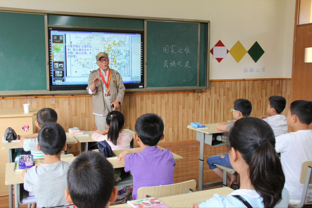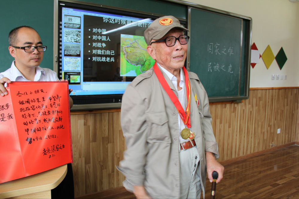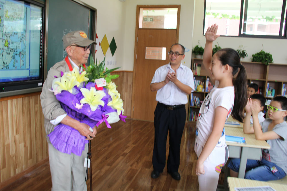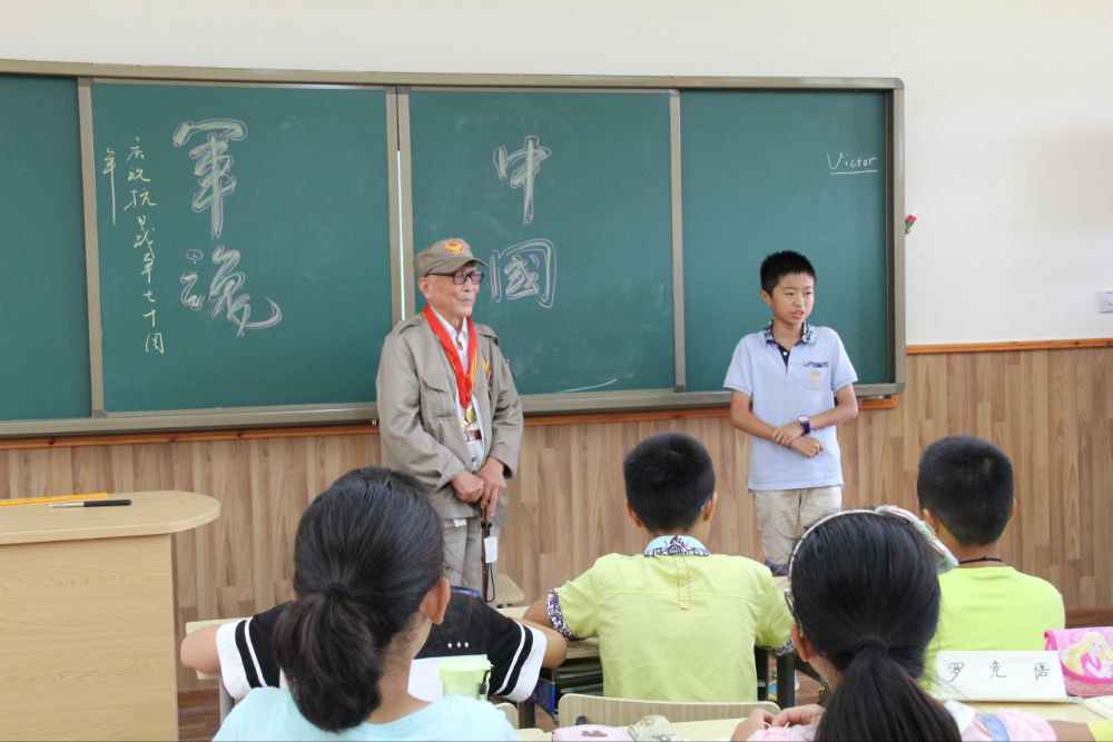 在五年级二班教室,老人全程观摩并参与了该班为纪念中国人民抗日战争暨世界反法西斯战争胜利70周年举行的主题班会,并详细向大家介绍了自己投笔从戎、保家卫国、痛击日军的抗战经历,在场师生无不被老人及他千千万万的战友展现出来的以民族大义为重、不怕牺牲、誓死如归、血染疆场的军人豪情和民族精神所深深感动。老师们纷纷与老人拍照留恋,记录下了这一珍贵的瞬间。同学们现场作文,用自己的笔写下了内心的感言,发出了“铭记历史、缅怀先烈、珍爱和平、开创未来”的铿锵誓言,并为老人送人最真挚的健康祝福。老人勉励小学和初一的同学们一定要牢记现在优越的学习生活条件来之不易,一定要珍惜时间,好好学习,提高本领,为祖国的繁荣昌盛和中华民族的伟大复兴做出自己应有的贡献。老人的讲述激发了大家的爱国情感,振奋了大家的民族精神,让大家受到了活生生的爱国主义教育。