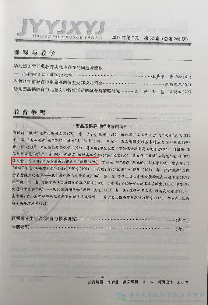 近日,我校黄永贵校长等撰文《不妨以发展的视角看“做课”》在《教育与教学研究》杂志2018年第7期“教育争鸣”栏目刊发。