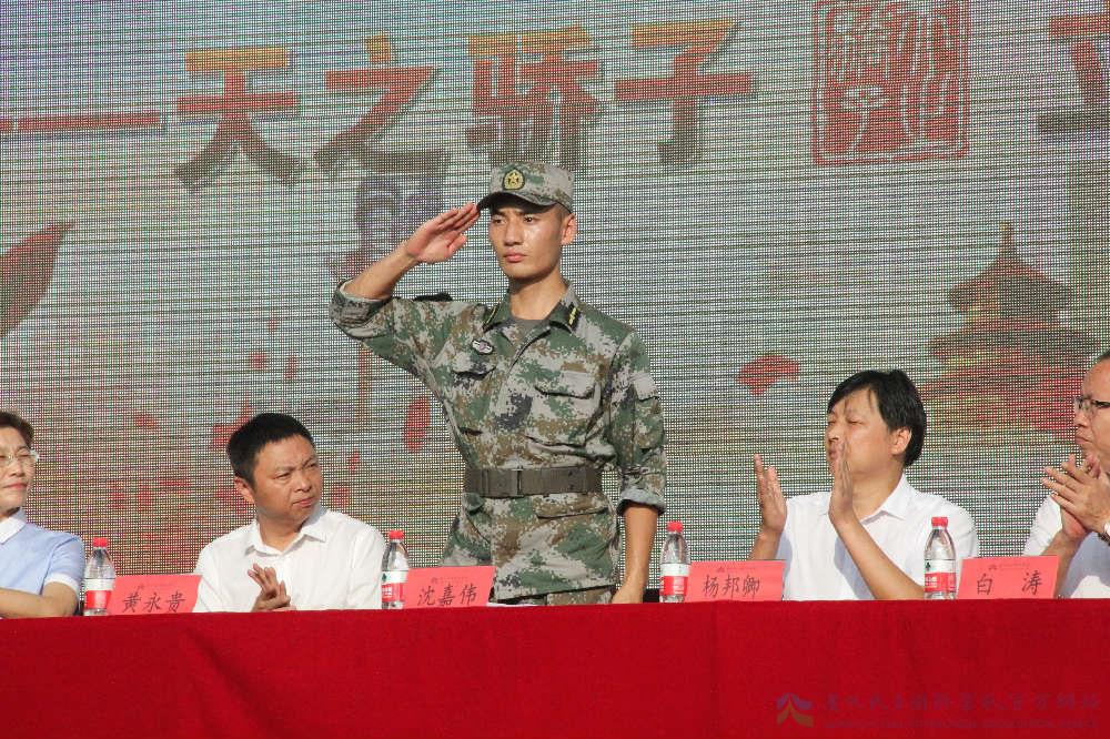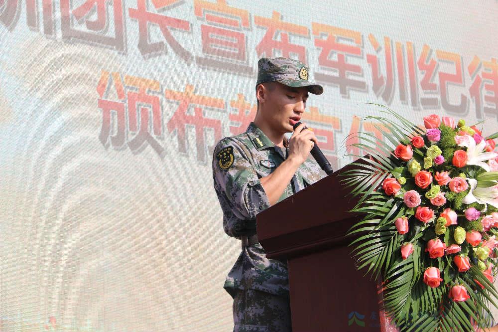 新生军训团沈嘉伟总教官宣布军训纪律要求并作军训承诺。他表示,全体教官将牢记此次军训任务,以军人的标准要求严格要求、科学训练、做好表率、言传身教,坚决圆满、成功、卓越地完成此次军训任务!