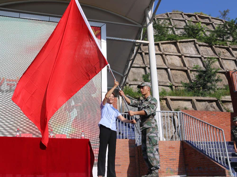 学校党支部书记、副校长薛述容女士代表学校向军训团团长授“军训团团旗”,各军训营教官向营长递交各营营旗。