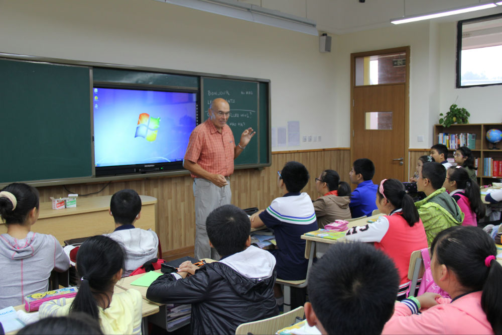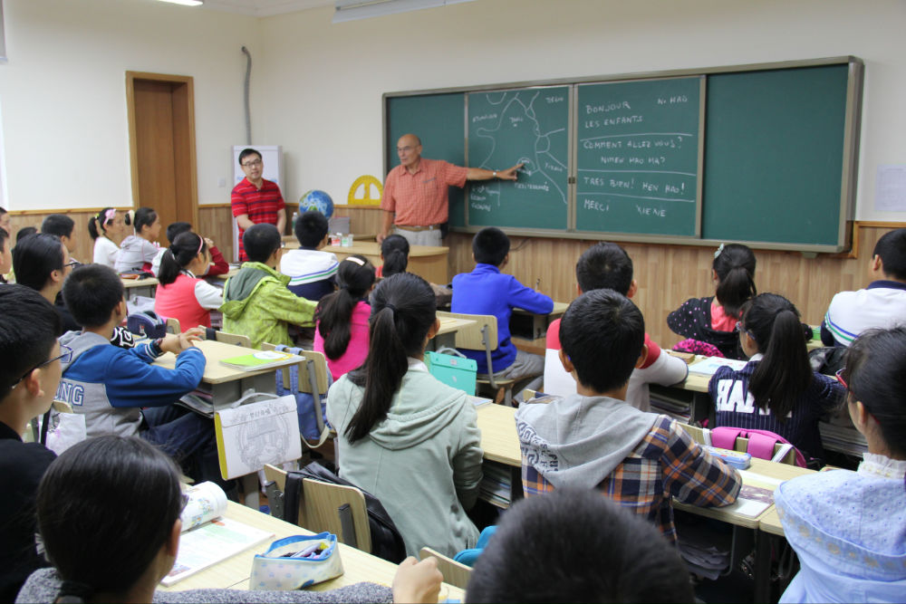 参观完钟灵毓秀、风景如画的天立校园后,黑米先生在初一五班给同学们上了一堂精彩的法语课。黑米先生亲切地和同学们问好,教给同学们日常的法语,如问好、谢谢等。此外,他还在黑板上绘制法国地图,介绍了自己工作、生活的地方,向同学们展示了极具法国特色的薰衣草花田的照片。和蔼、亲切的黑米先生让同学们十分喜欢,整个课堂充满欢声笑语。