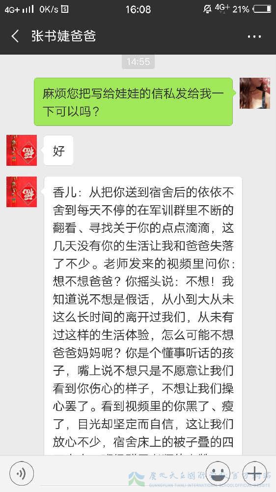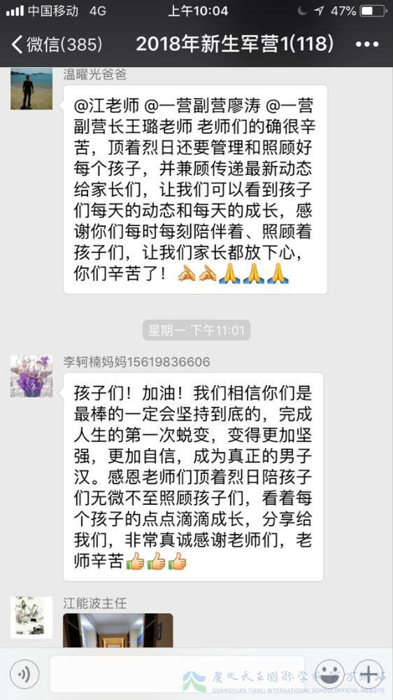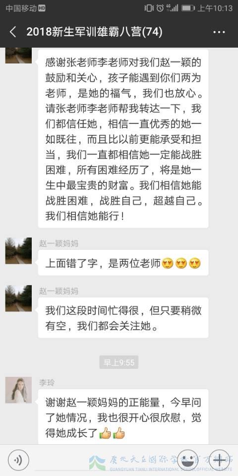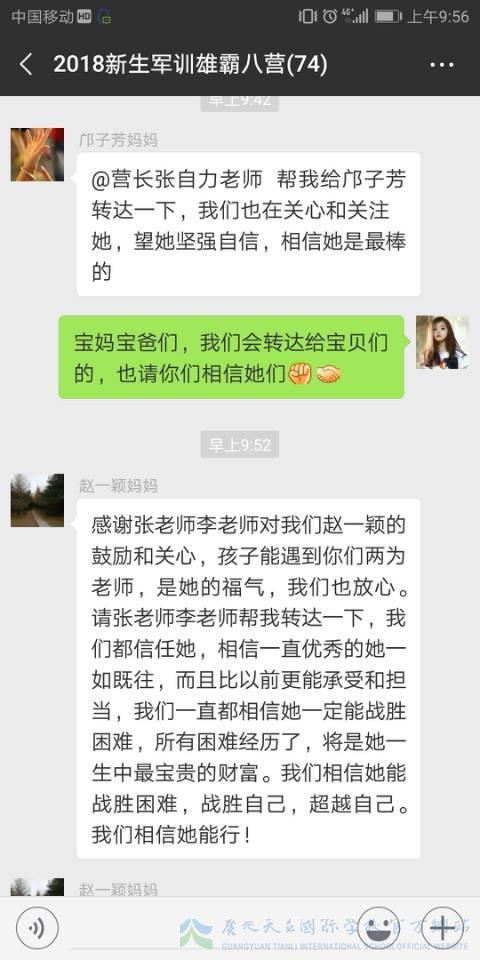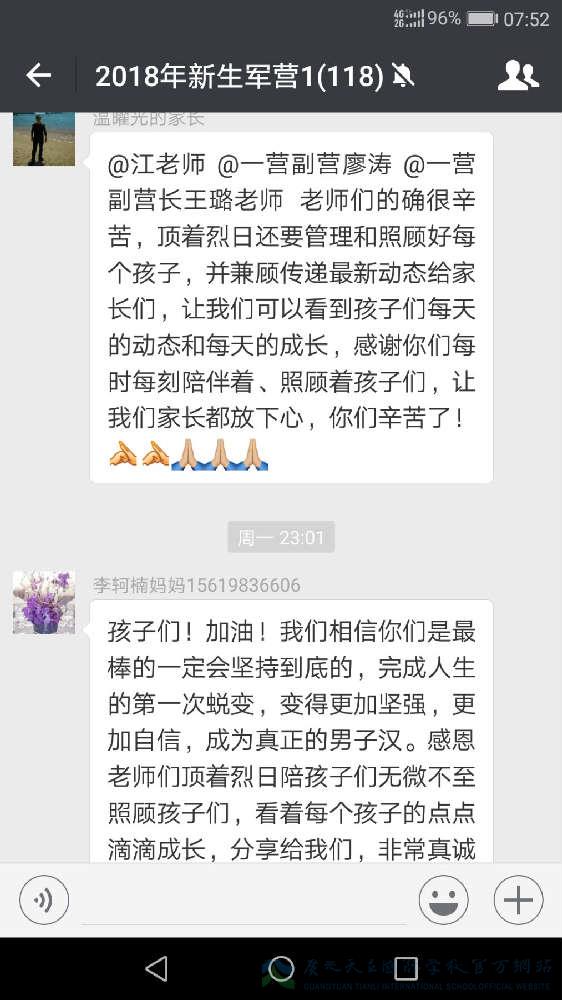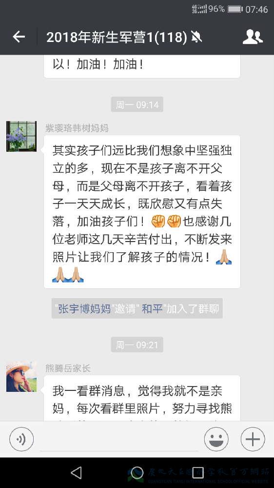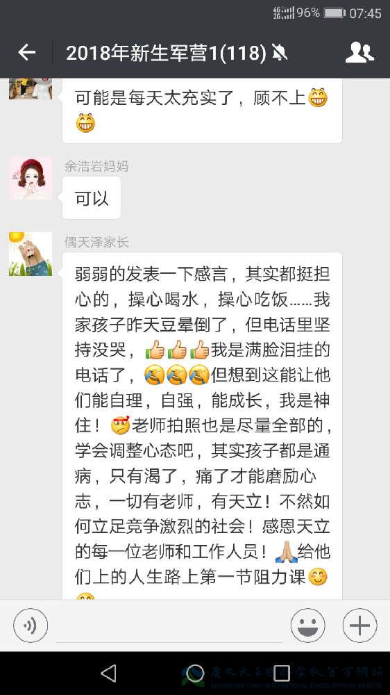 军训即将落幕,我们的孩子经历了几天的身体考验,那么我们的家长就经历了几天的心理磨难。牵挂、担忧、思念、心疼、骄傲……父母的心时时刻刻为我们孩子而跳动,种种滋味不断涌上心头,难以言语。虽然曾担忧、曾不舍、曾抗拒,但是随着孩子们一天天的进步,家长们按捺住忐忑的心,忍住不舍,放手让孩子们去自由翱翔。因为他们明白,人生有很多条路可以选择,但军训是孩子们必须去走的一条路。这一步很短,一生很长,但这的一步,却是可以让孩子走出孩童期、走出自我、走出自信的重要一步。虽然不能代替孩子去走这一步,但是我们的家长们用文字的方式在后方给予了孩子们最大的支持鼓励。