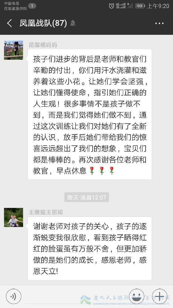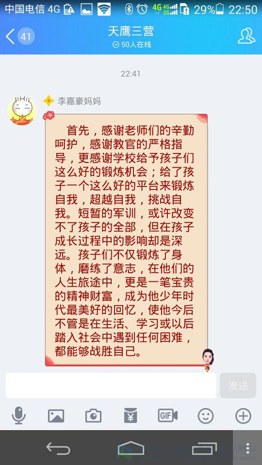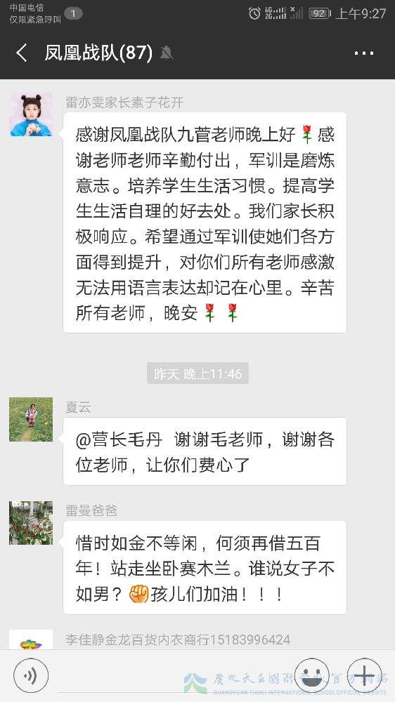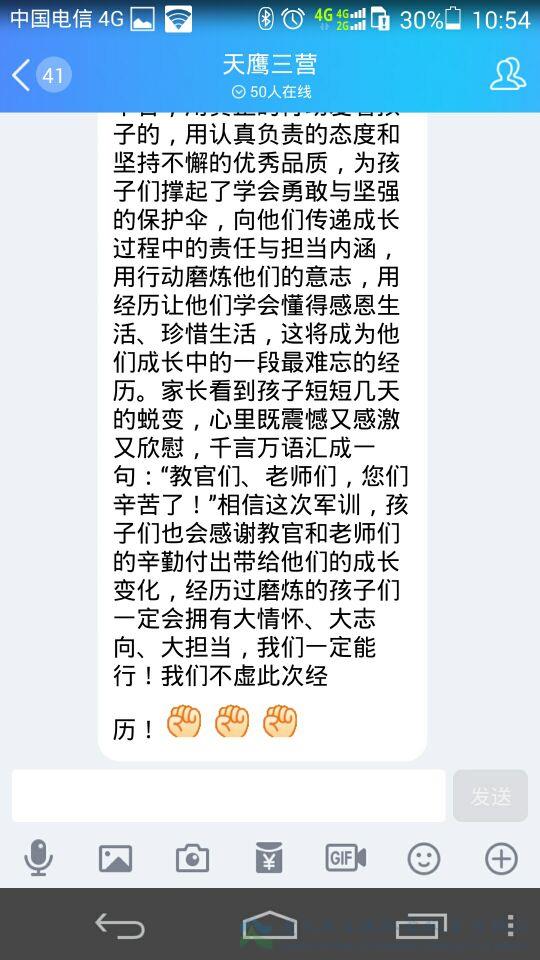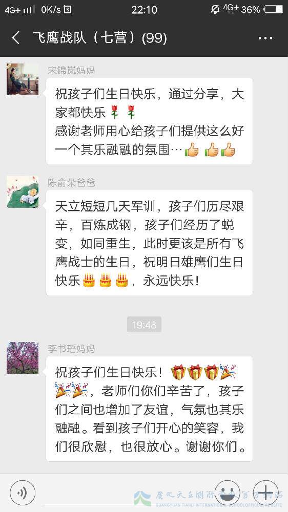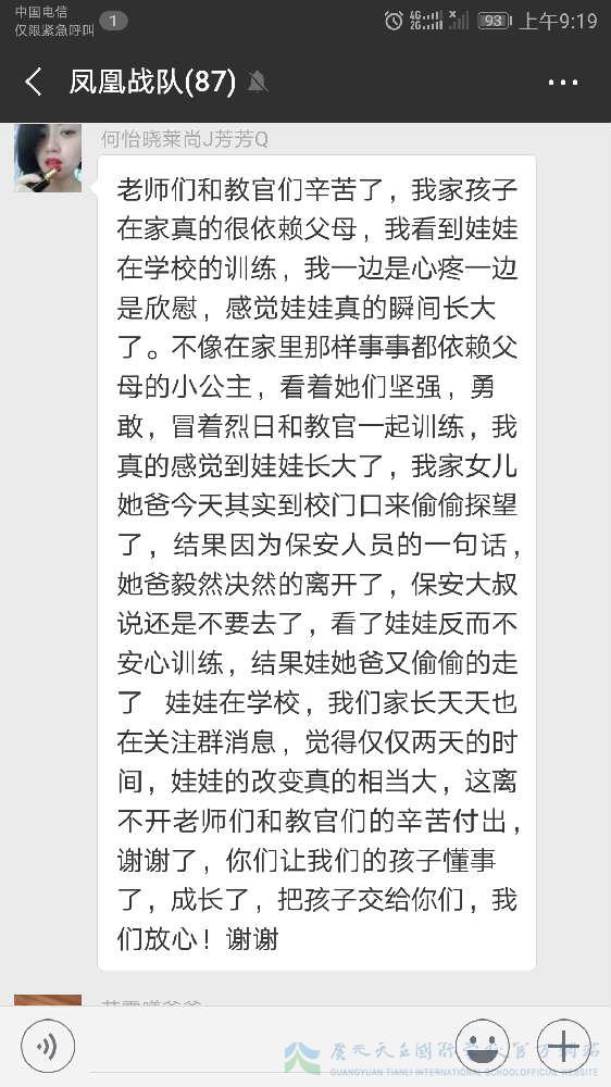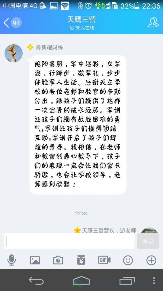 军训即将落幕,我们的孩子经历了几天的身体考验,那么我们的家长就经历了几天的心理磨难。牵挂、担忧、思念、心疼、骄傲……父母的心时时刻刻为我们孩子而跳动,种种滋味不断涌上心头,难以言语。虽然曾担忧、曾不舍、曾抗拒,但是随着孩子们一天天的进步,家长们按捺住忐忑的心,忍住不舍,放手让孩子们去自由翱翔。因为他们明白,人生有很多条路可以选择,但军训是孩子们必须去走的一条路。这一步很短,一生很长,但这的一步,却是可以让孩子走出孩童期、走出自我、走出自信的重要一步。虽然不能代替孩子去走这一步,但是我们的家长们用文字的方式在后方给予了孩子们最大的支持鼓励。